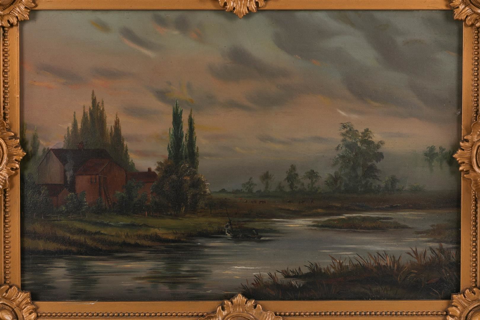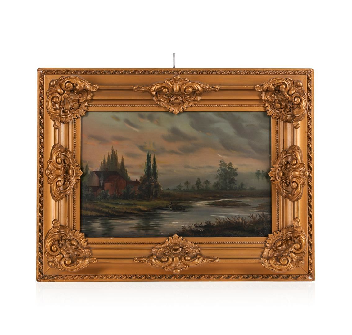 One 19th century original oil landscape painting on board, American School, Philadelphia. The art measures 18" x 11.5", with the frame measuring 26" x 20". The piece is in very nice estate condition with some small chips on the frame.