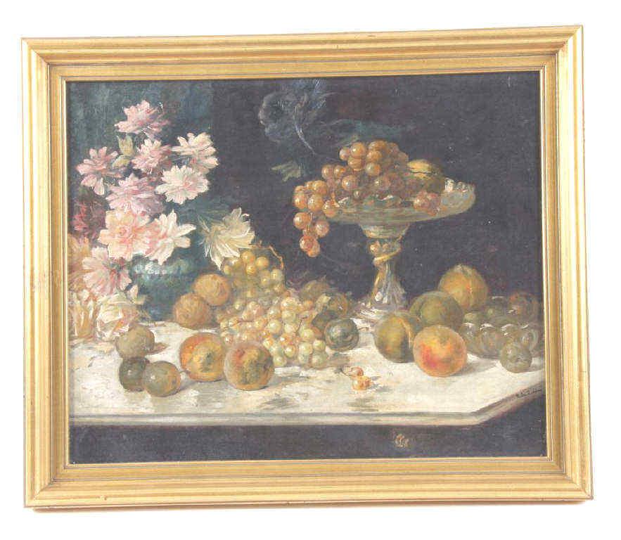 Original Oil on Board Signed S A Diaz Depicting a fruit still life, image size is 25"x21", in gold frame, very well done.Depicting a fruit still life, image size is 25"x21", in gold frame, very well done.