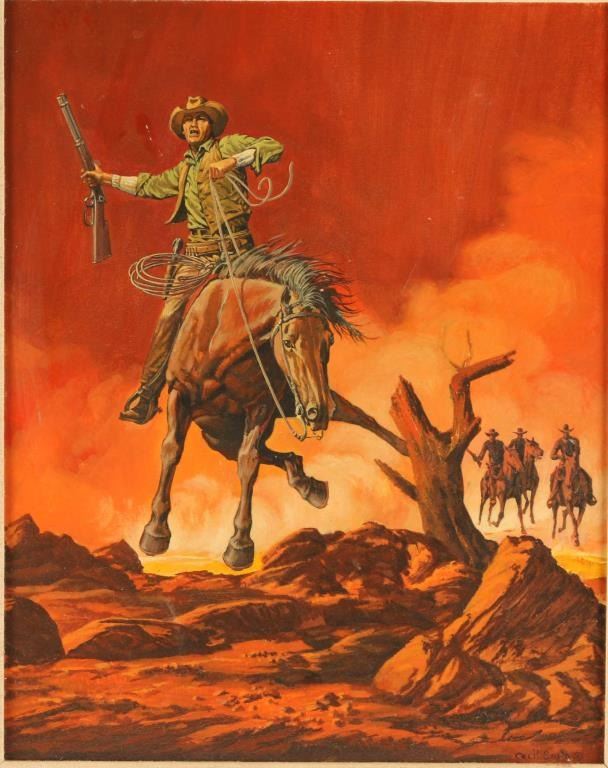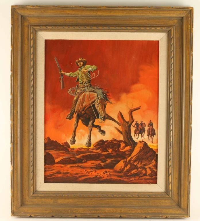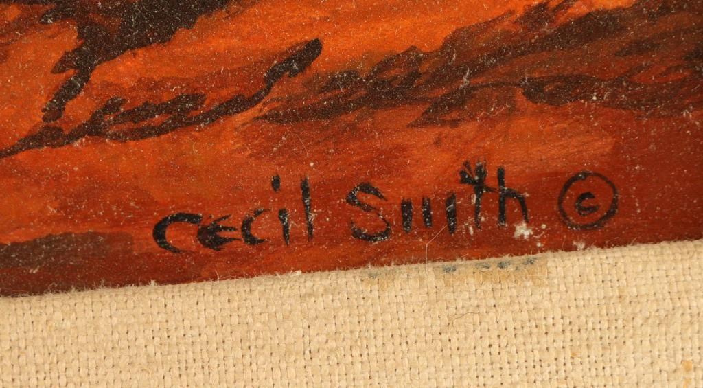 "This Way" signed lower right. Image measures 19 1/2" x 15 1/2" in carved wooden frame with linen inset. Experts in the field of Western art have called Cecil Smith (1910-1984) "the Dean of Cowboys who are Artists" with good reason. He has ridden more miles on horseback, punched more cows, and worked as range riding cowboy more than any other artist of record. Cecil has involved himself in a lifetime of Western art, 69 years of it to date. From the time he was old enough to hold a pencil, he was busy drawing wild range horses and cattle, cowboys and Indians and those especially "Western" subjects he has known since birth. Cecil's family provided him with the best and most sophisticated art education money could buy. He was personally tutored by three of America's greatest masters - Max Weber, John Carroll and Yasuo Kunlyoshi. During the 1930's, Francis Biddle, under the direction of President Franklin D. Roosevelt, selected several American artists to represent America in the Paris Exposition. Cecil's work was selected to represent the West. Throughout his long, successful career, Cecil has been featured in many national and international publications. The awards, honors and galleries and museums where his work has been exhibited number in the hundreds.