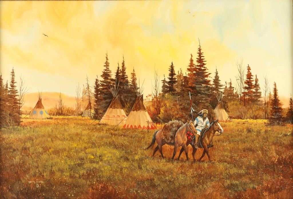 "The Mountain Man Trader" signed lower left. Image measures 14 7/8" x 21 1/2" in gold frame mounted on suede mat with brass title plate and wood frame. Gerry Metz is a painter and sculptor in realist style of Old West subjects. He settled in Scottsdale, Arizona in 1971. Gerry was born, raised, and educated in Chicago, attending Wright Junior College and the School of Professional Art . After that he was a commercial artist and director of the Village Art School in Skokie, and he was also an instructor of Oil Painting and Life Drawing at the Phoenix Art Museum. Working in Arizona, Gerry tries to imagine what it was like one-hundred years ago. Gerry's work is in collections in Arizona, including the Valley National Bank, Wrigley Mansion, and in other locations including the Franklin Mint and Miles Laboratories. He has exhibited in the Biltmore Celebrity Show in Los Angeles, the Governors Invitational in Cheyenne, Wyoming and the Peppertree Americana in Santa Ynez, California.