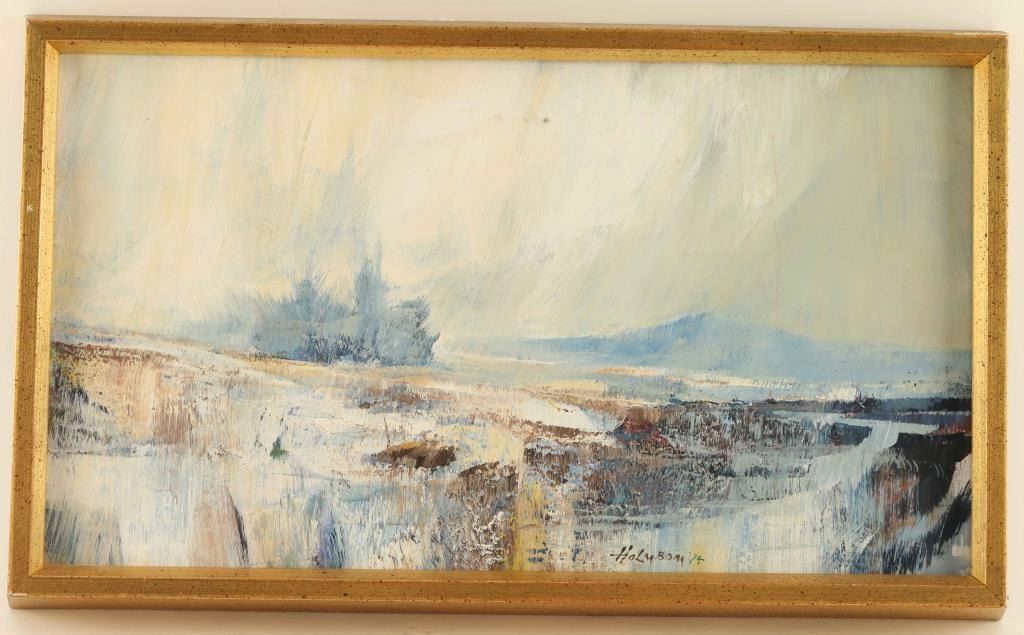 Winter landscape, signed lower right. Image measures 8 3/4" x 15 3/4" in gold wood frame. James William Holbom was born in 1926 and currently lives in Maine where he continues to paint.