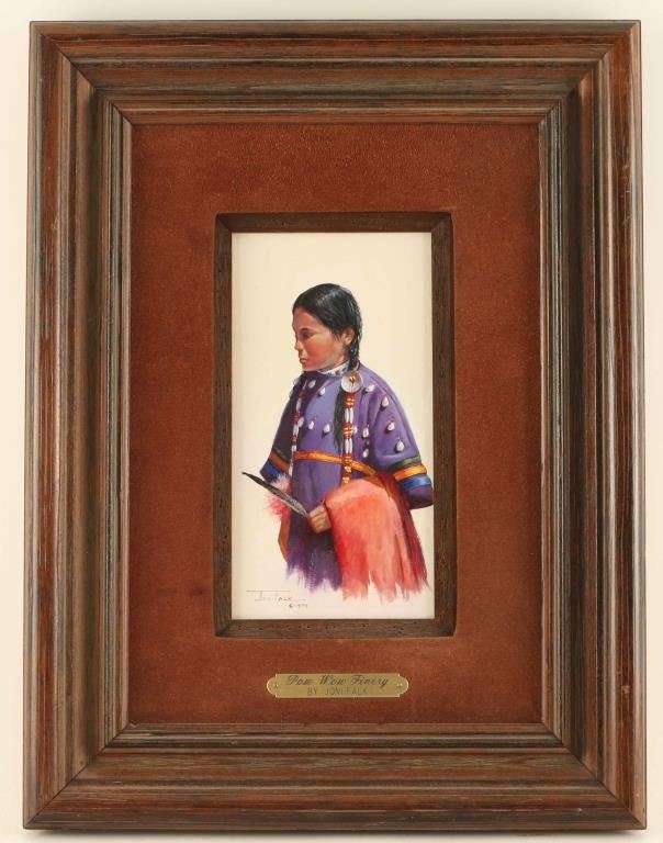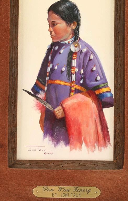 'Pow Wow Finery' signed lower left. Image measures 8 1/4" x 4 1/4" in wood fillet, suede mat with title plate and wood frame. Joni Falk realist painter of still life and landscapes, has lived in Phoenix, Arizona since 1960. She grew up in Chicago, and graduated from Marquette University in Milwaukee, Wisconsin. It was the Southwest culture and history that compelled her to seek a full-time career in the field of art. She has become known for traditional floral still lifes, western still lifes, Pueblo or Plains Indian landscapes and Indian figures. Falk's exhibitions include The National Museum of Wildlife Art in Jackson, Wyoming; the Albuquerque Museum, Albuquerque, New Mexico; Cheyenne's Old West Museum; The Tucson Museum of Art, Tucson, Arizona; and the Desert Caballeros Museum in Wickenburg, Arizona; the McAllen Museum, McAllen, Texas; and the Phippen Museum, Prescott, Arizona.