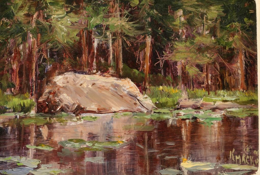 "Nymph Lake Reflections" signed lower right. Image measures 4 1/4" x 6 1/4" in gold wood frame with linen insert. Karol, an Oil Painters of America (OPA) Signature Member, is most inspired by painting on location as she believes that it allows the artist to more realistically capture the light, mood and feeling of the area. Her method of applying the luminosity of watercolor to an oil painting is found in all her artwork. Karol currently has studios in Colorado and New Mexico.