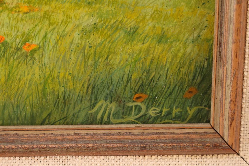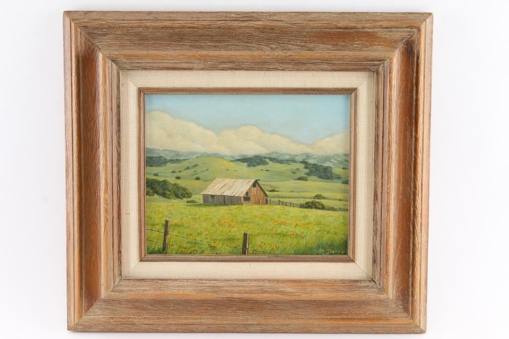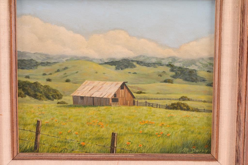 Depicting a farm scene. Measures 9 1/2 x 8" in wood frame.