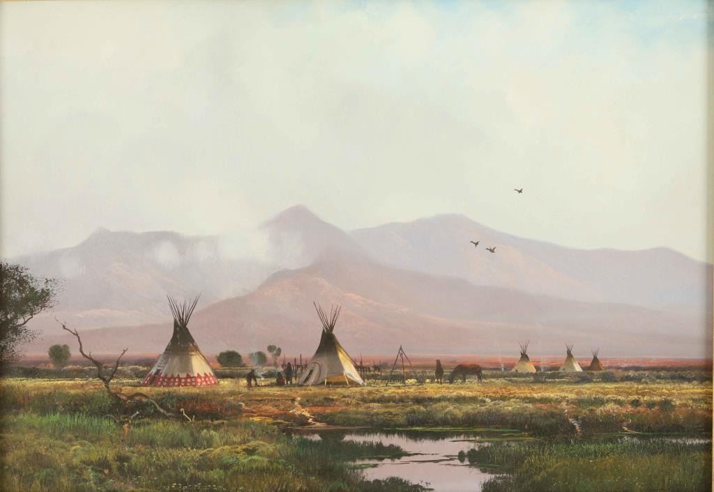 depicting an Indian camp. Image measures 12"x14" in wide gold frame. Excellent condition. Michael Coleman grew up fishing and hunting in the countryside surrounding his home of Provo, Utah. His boyhood experiences in the wild compelled him to become a painter...to create those "magical moments". Coleman received his formal art training at Brigham Young University and at the San Francisco Art Institute. He has exhibited in numerous gallery shows, including a one-person show at the Kennedy Galleries in New York, and was given a retrospective at the Buffalo Bill Historic Center. He is also a regular exhibitor in the Celebrity Exhibition, Biltmore Gallery, Los Angeles, California. He is listed in "Who's Who In American Art" and has been featured in several major magazines: Southwest Art, Sports Afield and Gray's Sporting Journal.