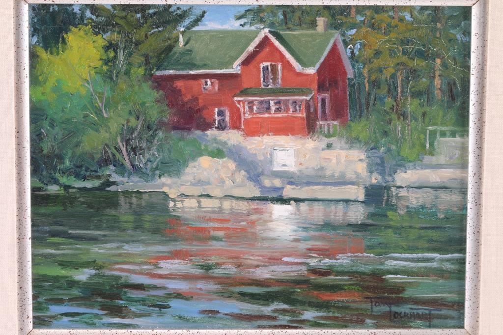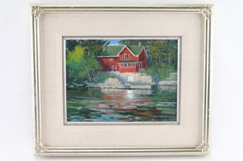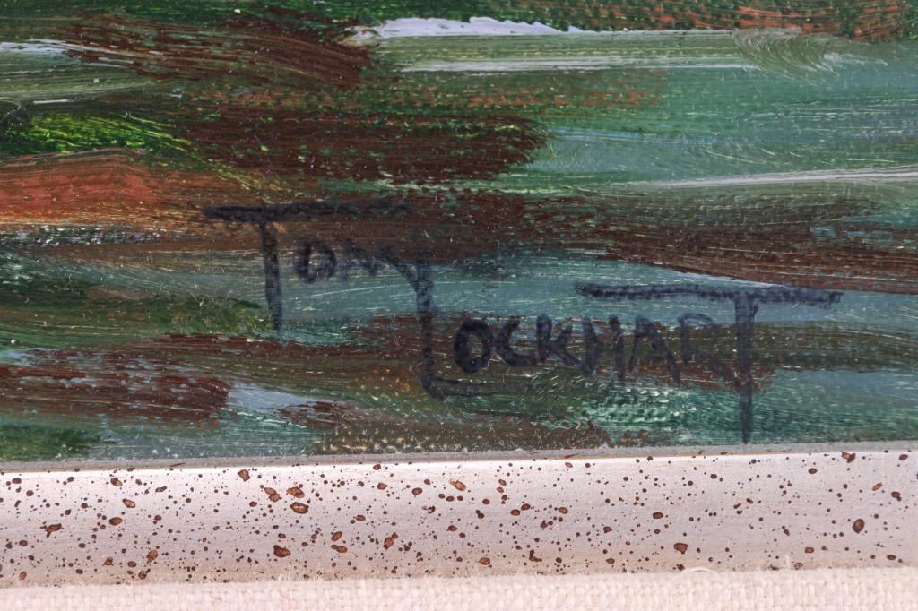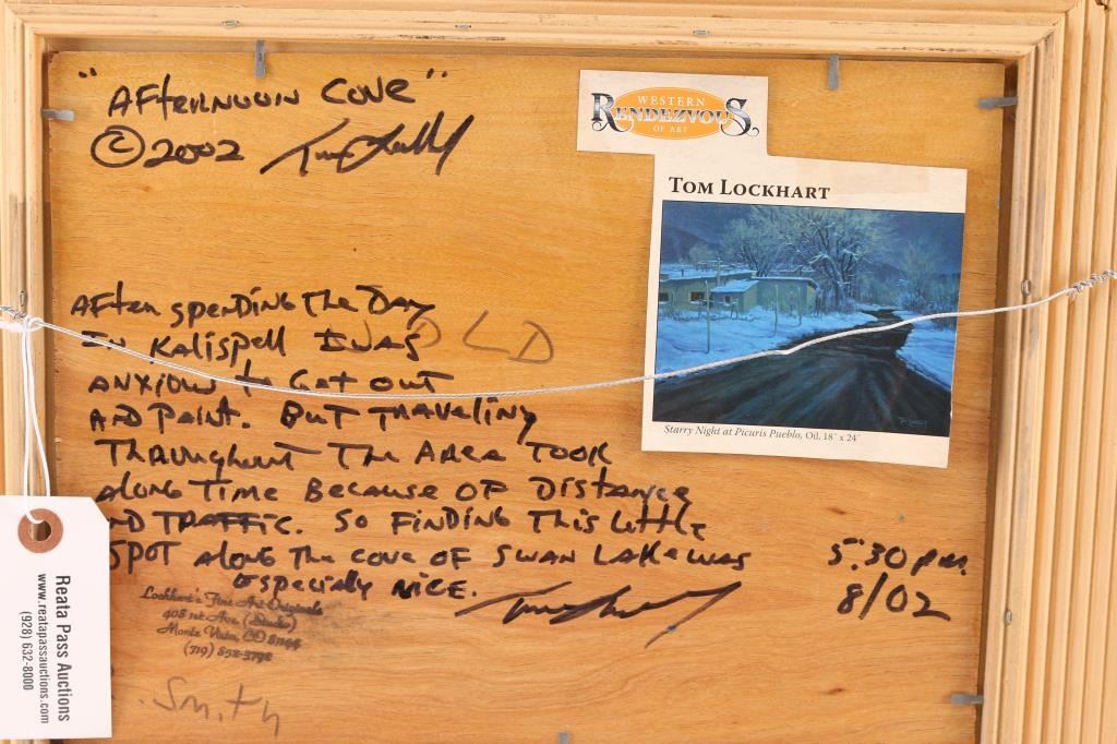 Entitled Afternoon Cove. Signed lower right. In pewter frame. Measures 12x9". Depicts a lakeside scene. Tom Lockhart, born 1952, active, lives in CO, known for landscape and still life.