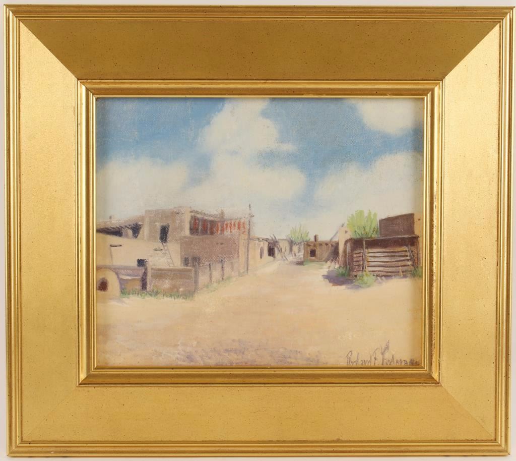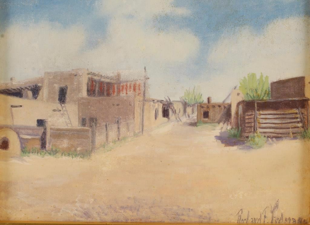by Richard Fredrick Erdmana, entitled "Isiletq Pueblo". Signed in lower right hand corned, measures 10" x 12" in gold frame.