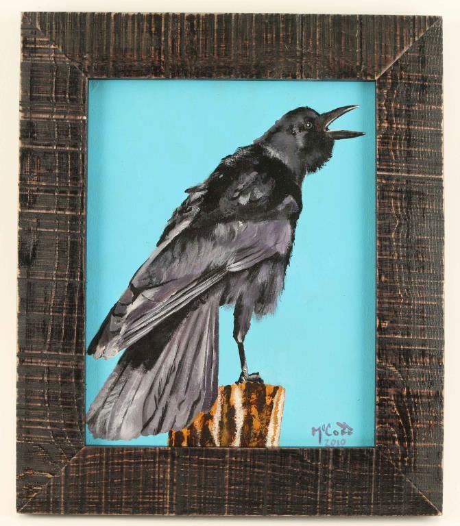 depicting a squawking blackbird on a stump. Signed McCobb lower right. Image measures 9 1/2" x 7 1/2" in wood frame.