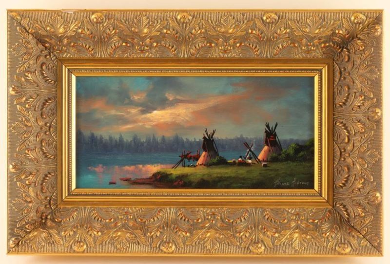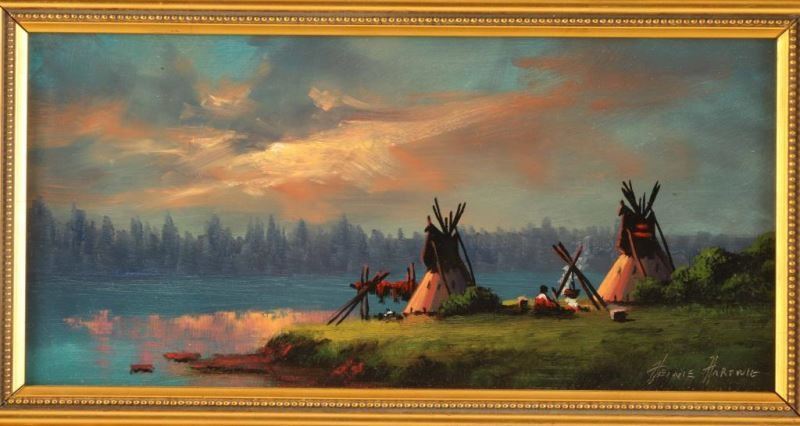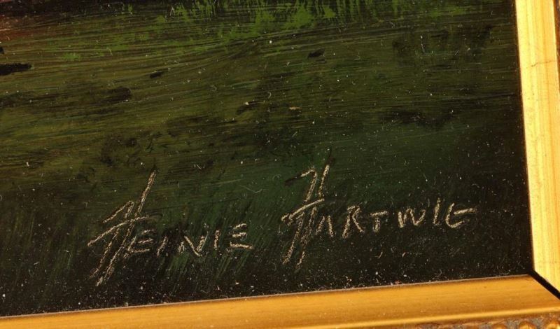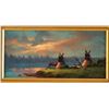 by Heinie Hartwig entitled Late in the Day hand signed lower right hand corner, in gold gilt frame measures 11.5"x6.5". Heinie Hartwig became a painter of primarily western subjects although he also does landscapes and still lifes. The tone of his work is primarily romantic. He started painting in 1970, working on his art in the evenings, and a year later quit his job and began painting for a living. He had grown up in the Santa Clara Valley of California, and left for three years to spend time traveling through Europe with the Army. He was in Germany as the Berlin Wall went up. By 1991, he was in "Who's Who in American Art". Hartwig taught himself to paint by studying the "Old Masters." He was attracted to the charm and romance of classic art. He has managed to capture the light, color and style of those great artists. Though most of his work has a western theme, Hartwig is a versatile painter. Many of his paintings are landscapes and still lifes. Heinie Harwig's work has been compared to Albert Bierstadt and John Constable for its romanticism, European feel and composition.