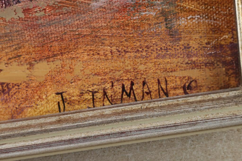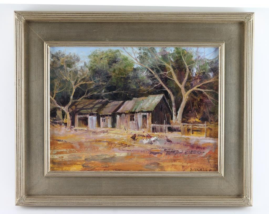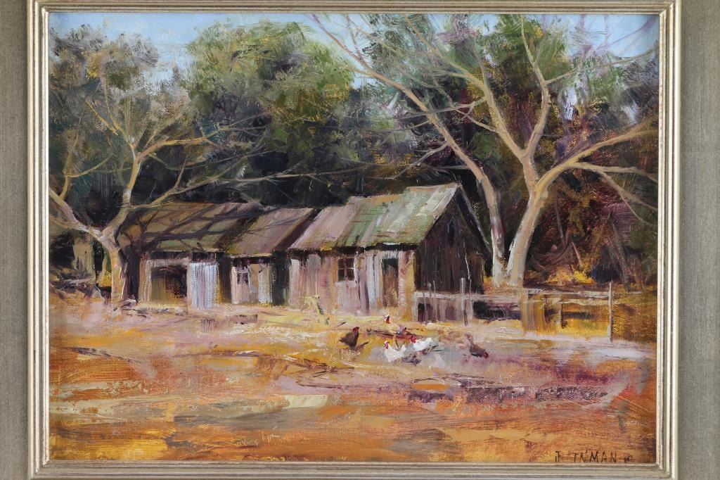 by J. Inman depicting chickens by the barnyard, signed lower right hand corner. Image size 16"x11". Jerry Inman (Born 1946) is active/lives in Montana. Jerry Inman is known for Western landscape, figure.