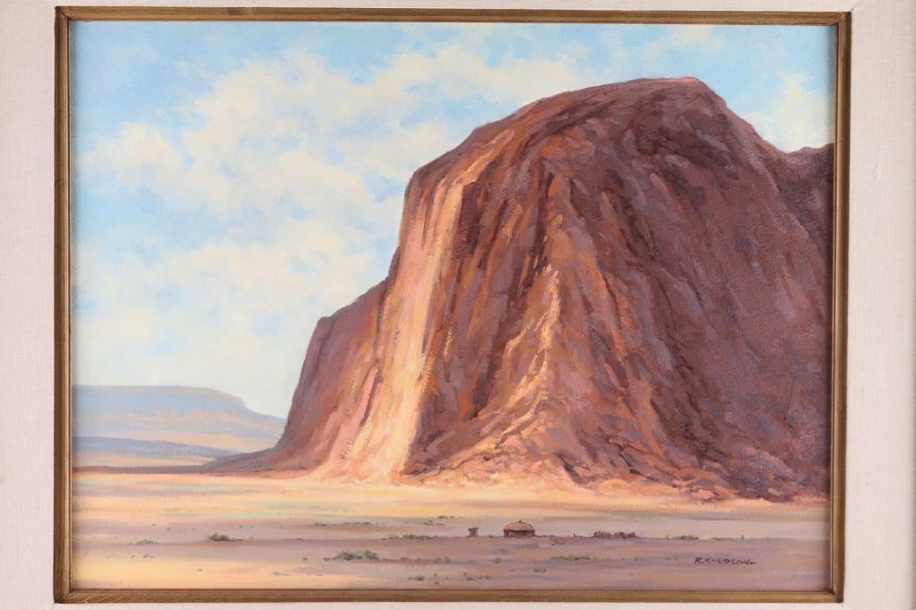 by Prescott Valley artist, Robert Knudson, called "Land of the Giants", hand-signed lower right, measures 24x18". The work of Bob Knudson is represented in major collections through out the US including the William Penn Memorial Museum amd the Museum of Northern AZ. His painting frequently appear in Arizona Highways and he has been member of the Mountain Oyster Club the oldest and most prestigious cattleman's club in the Southwest.