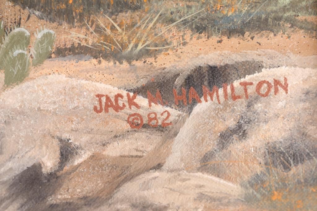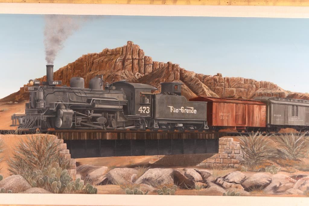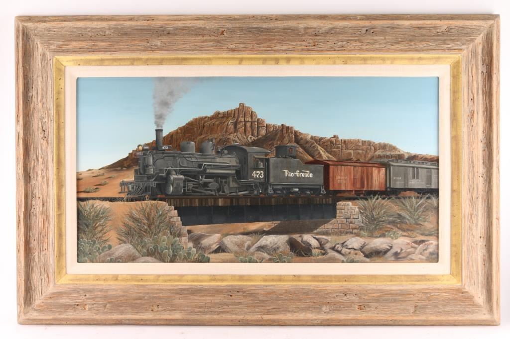 By Colorado artist, Jack M. Hamilton, depicting the Rio Grande train. Hamilton loved the outdoors, natures wildlife and American history. He spent years watching, studying and photographing his favorite subjects, often from his working cattle ranch in southern Colorado. Painting on both canvas and panel, Jack worked entirely in the medium of oil. Self-taught, Jack painted in the manner of the old masters. Hamilton was exhibited at many of the countrys finest galleries and at many fine art shows. His work has been featured on the cover of, as well as in, national magazines.