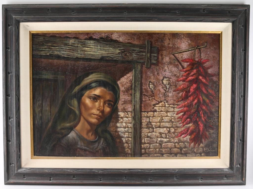 By Virginia Dan depicting Mexican girl with chili peppers. Signed lower right hand corner, Measures 36"x24". Virginia Dan (1922 - 2014) was active/lived in California, is known for Figure and genre painting.