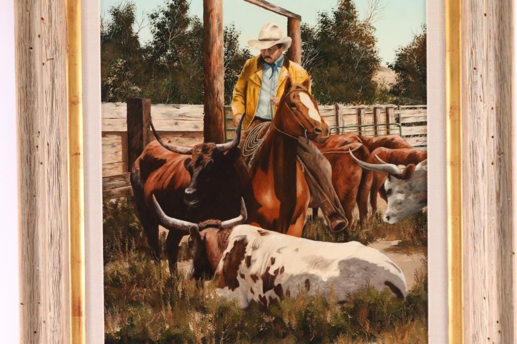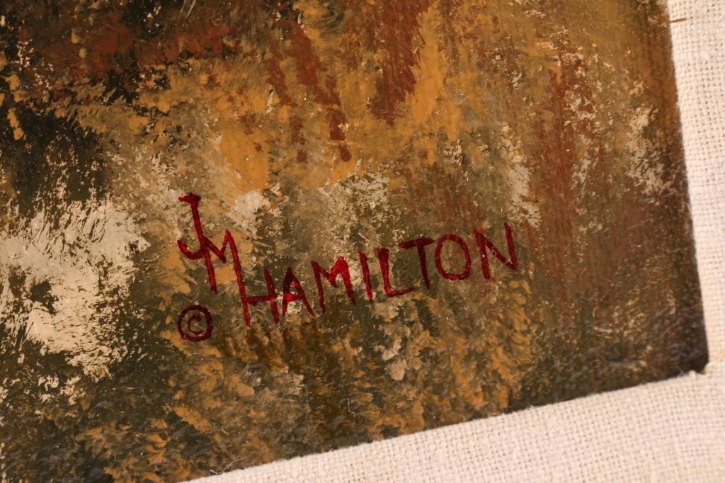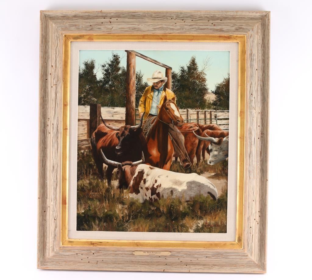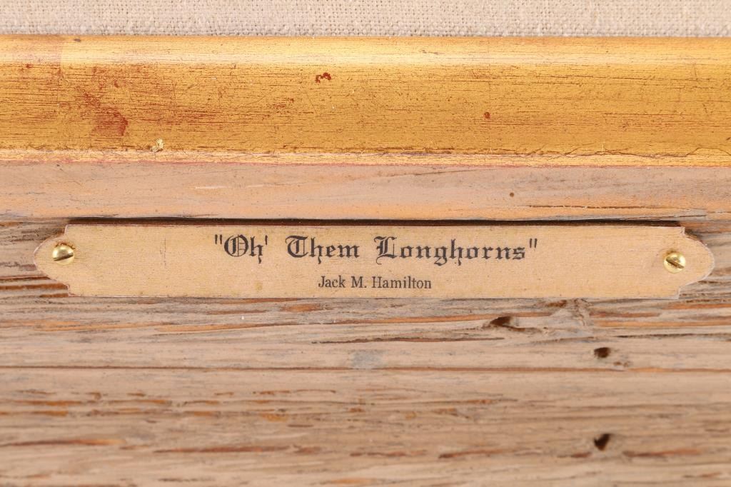 By Colorado artist, Jack M. Hamilton, entitled "Oh Them Longhorns". Hamilton loved the outdoors, nature's wildlife and American history. He spent years watching, studying and photographing his favorite subjects, often from his working cattle ranch in southern Colorado. Painting on both canvas and panel, Jack worked entirely in the medium of oil. Self-taught, Jack painted in the manner of the old masters. Hamilton was exhibited at many of the country's finest galleries and at many fine art shows. His work has been featured on the cover of, as well as in, national magazines. Measures 34 x 30. Framed in natural wood frame with inner gold lining.