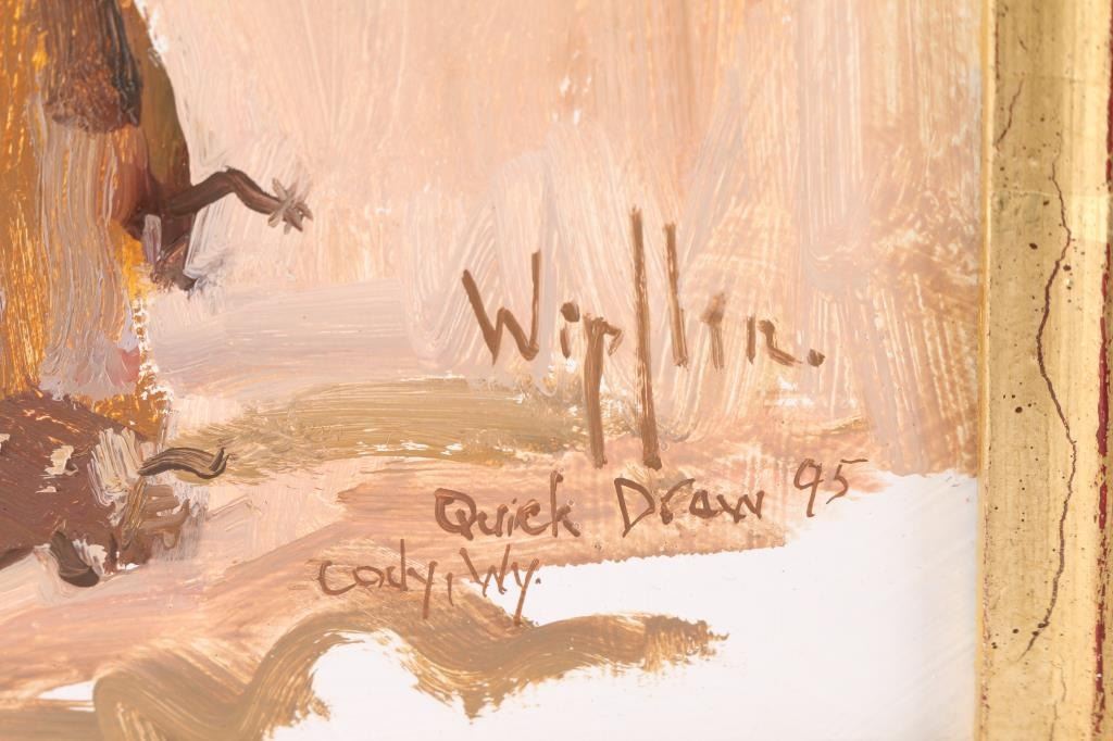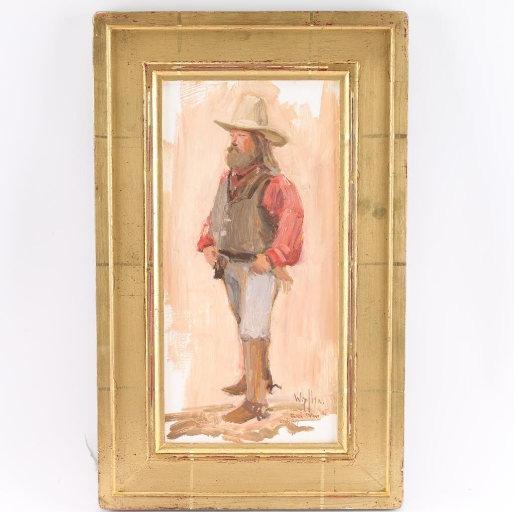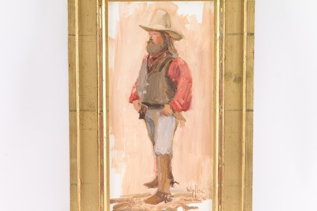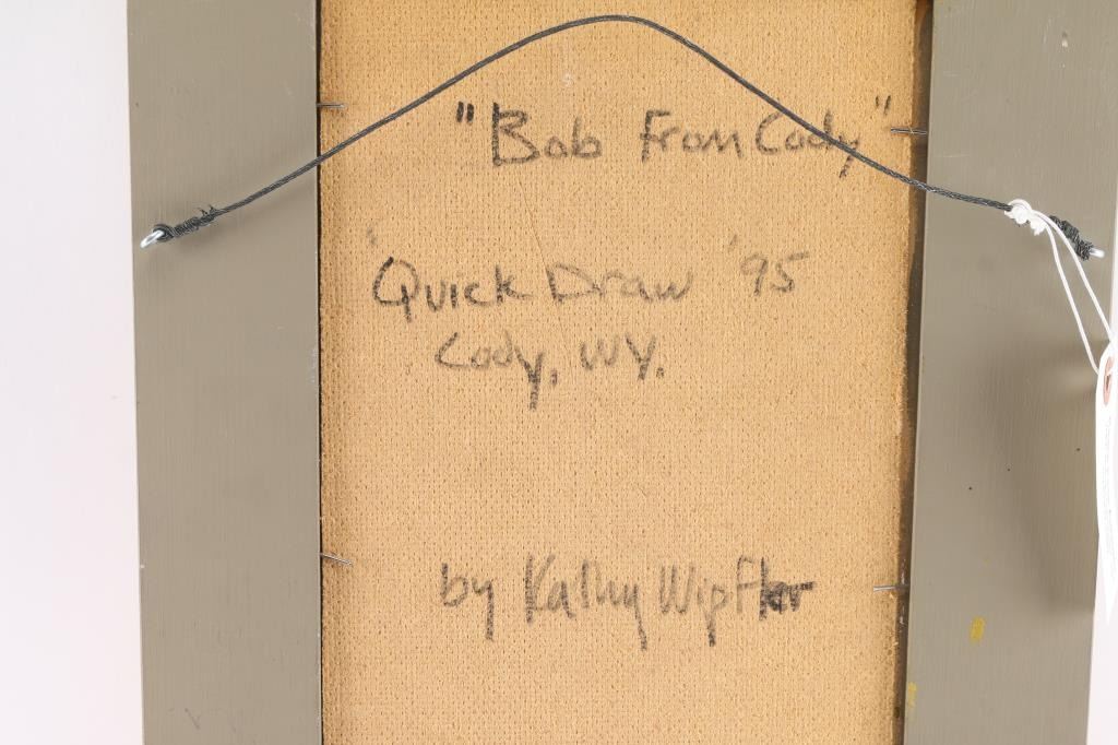 Entitled "Bob From Cody", by Katherine Wipfle in a 1995 quick draw in Cody, Wyoming. Measures 18 1/4" x 11 1/4" in gold wood frame; painting measures 13 1/4" x 6 1/2". Katherine Wipfler was much influenced by plein-air painters Conrad Schwiering and John Clymer. She settled in Jackson, Wyoming, where she keeps a regular painting schedule and also gives workshops. Her favorite medium is oil and her subject matter includes wildlife, domestic animals as well as figures in landscape. In 1999, she was commissioned by Wyoming Governor and Mrs. Jim Geringer for signed, numbered, and framed prints of her original painting "Wyoming Treasure." They presented them as gifts to governors at the Western States Governor's Conference in Jackson, Wyoming.