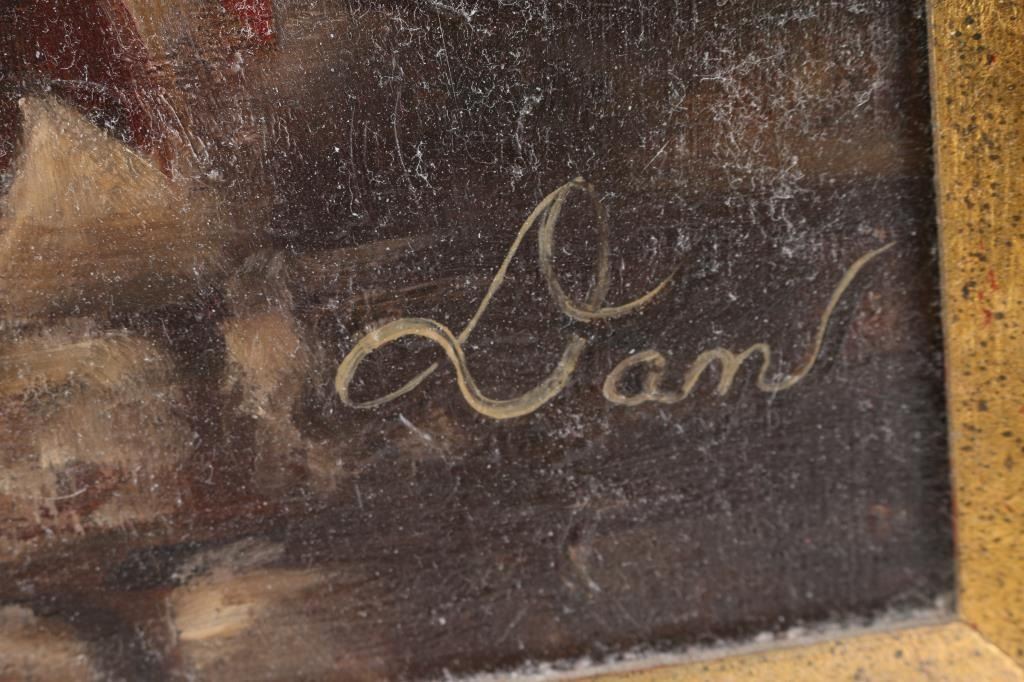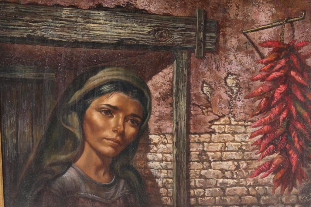 By Virginia Dan depicting Mexican girl with chili peppers. Signed lower right hand corner. Measures 36"x24". Virginia Dan (1922 - 2014) was active/lived in California, is known for figure and genre painting.