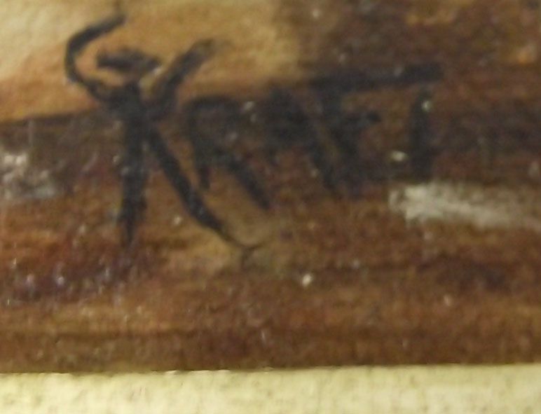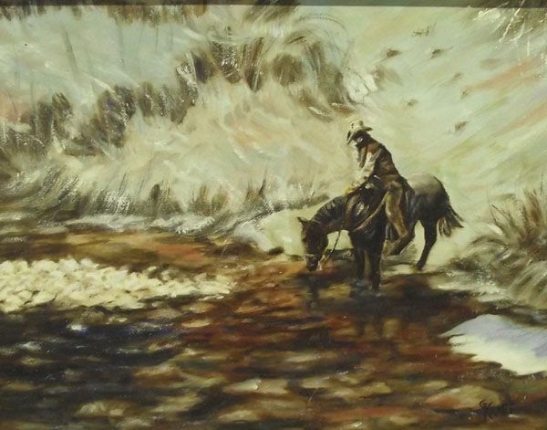 Original Oil on Canvas ''Arizona Cowboy'' by Kraft. Nicely executed oil of a cowboy letting his horse have a drink in a stream. Framed size is 13''x16'', visual 9''x12''.