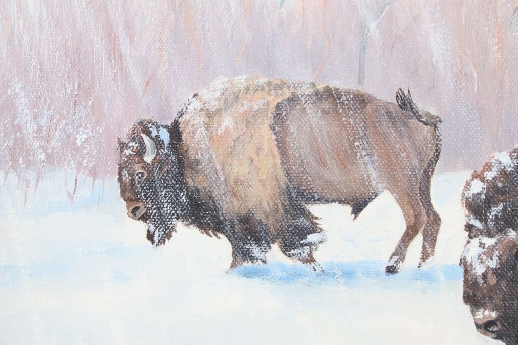 Featured in this lot is this original oil on canvas Buffalo Snowy Day" by artist ADAY. The painting is a wonderfully and professionally crafted oil on canvas construction that features a scene of of buffalo walking across a creek in the middle of an active snow storm. The artwork is signed 'ADAY' in the bottom right hand corner and the back of the frame is marked 'Rossell.' The condition of this original painting is good with no obvious signs of damage and shows good overall condition. The measurements of this framed oil painting is 21" x 25" and the visible art measures 15 1/2" x 19 1/2".