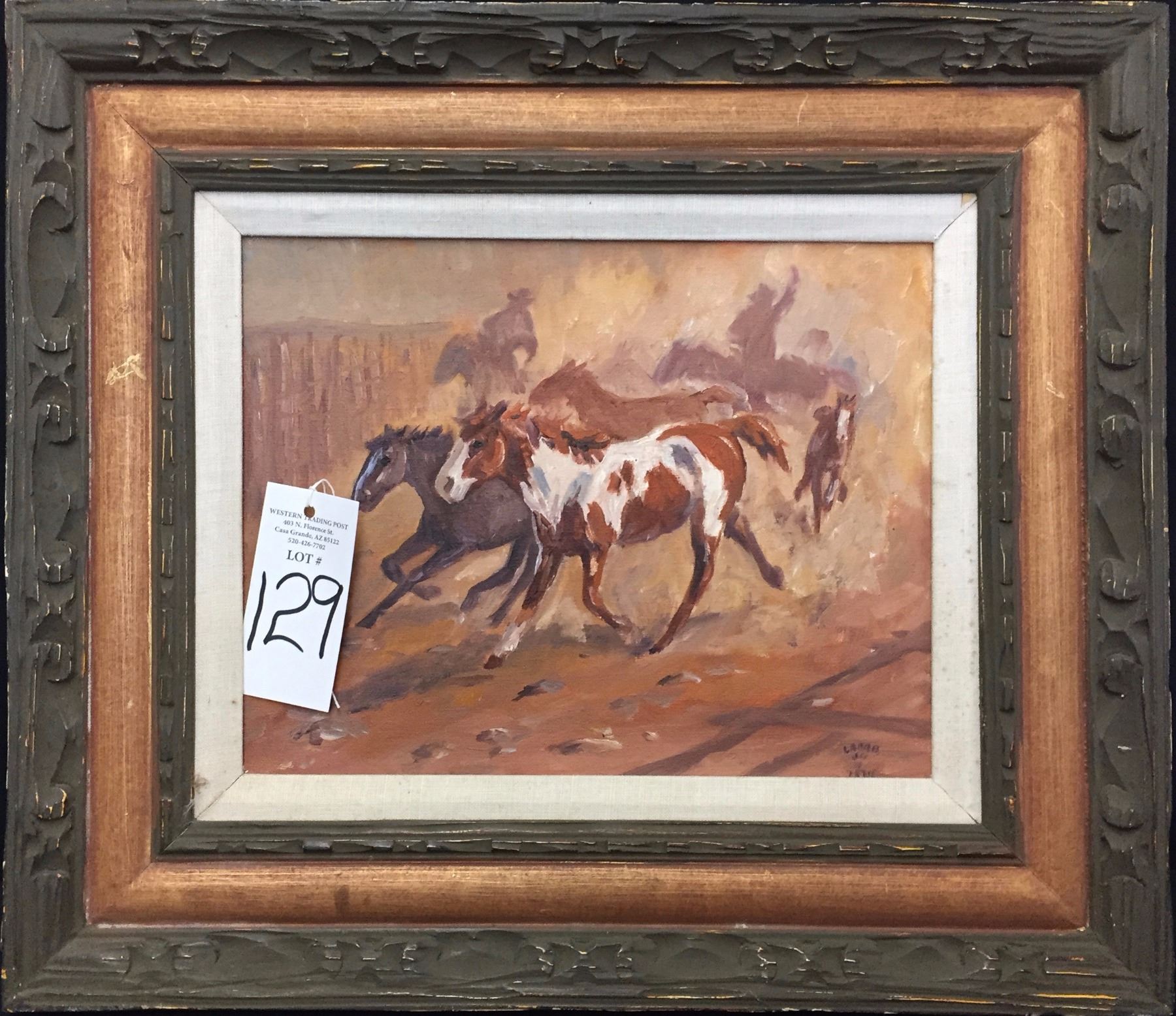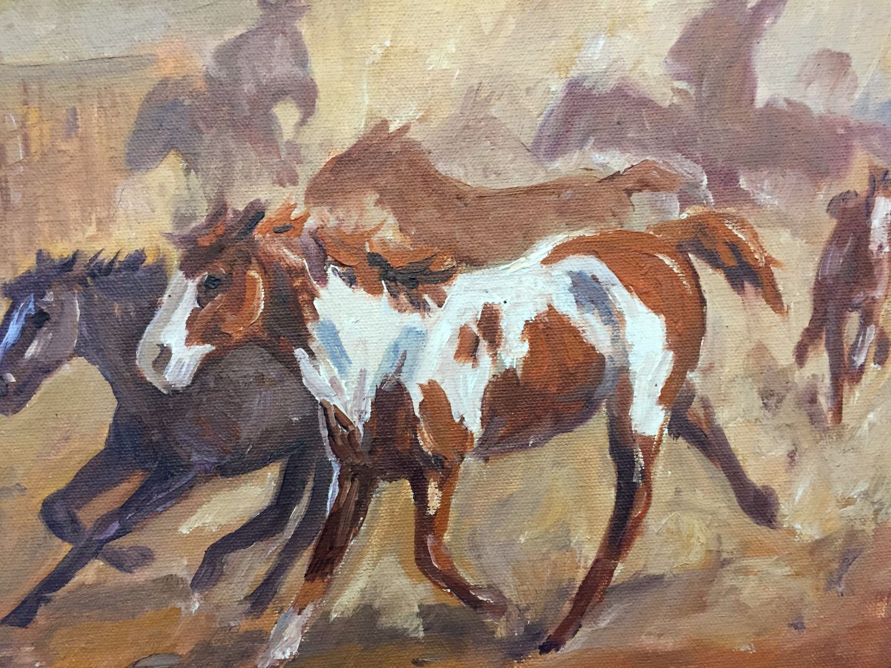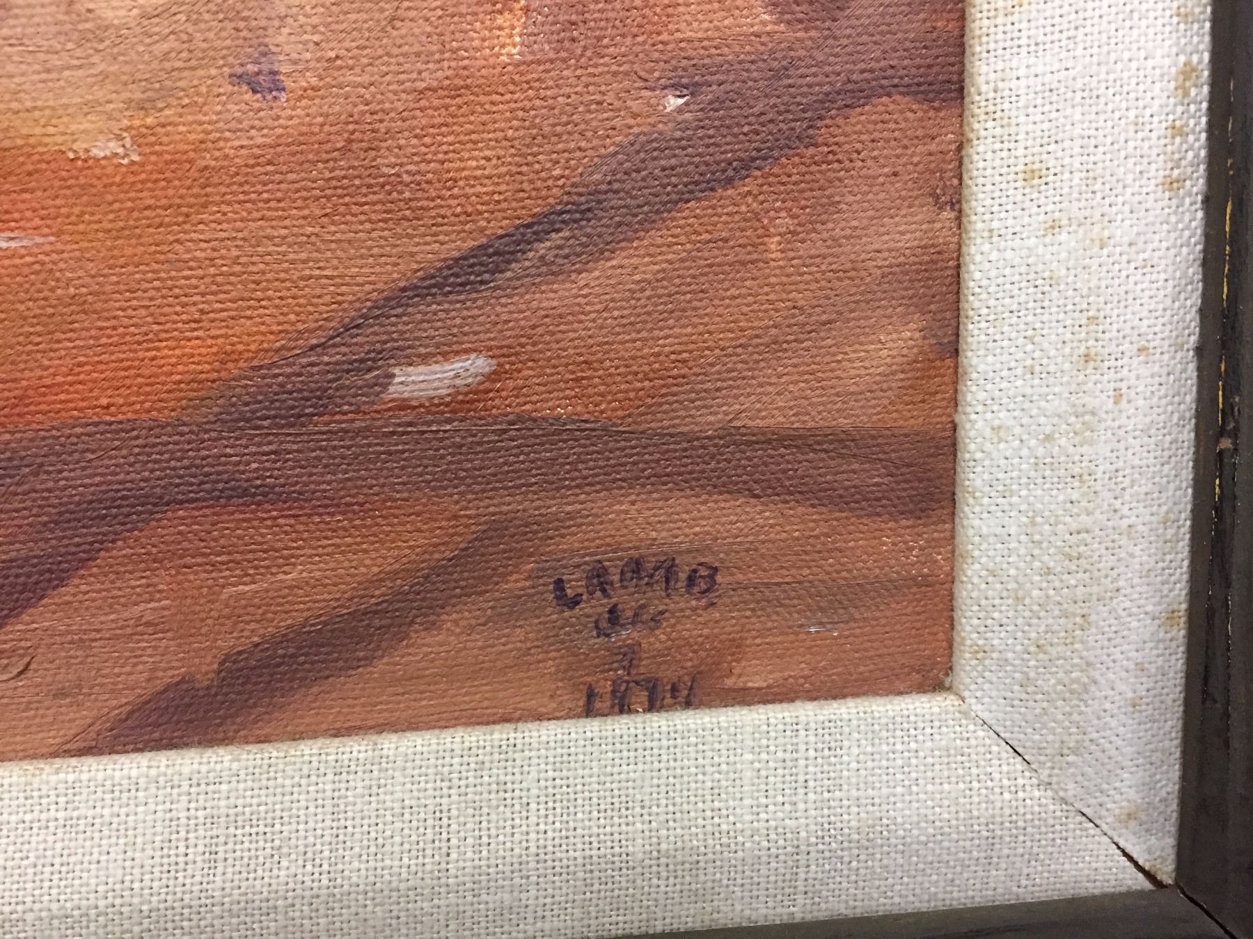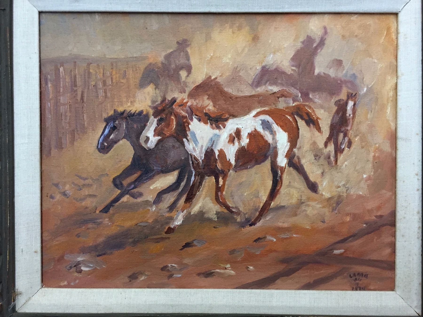 Maker: Landon W. Lamb (1937 - 2016). Approx. Age: 1974. Size: 22” x 19 1/4” includes frame. Additional Info: Wrangling Horses - Original Oil on Canvas - Landon Lamb. Condition: Good for its age, normal wear expected. Please look closely at the pictures - they are an important part of our description. Shipping: There will be a $10 handling / packaging fee for shipping this lot. The actual cost of postage will be added on top of that.