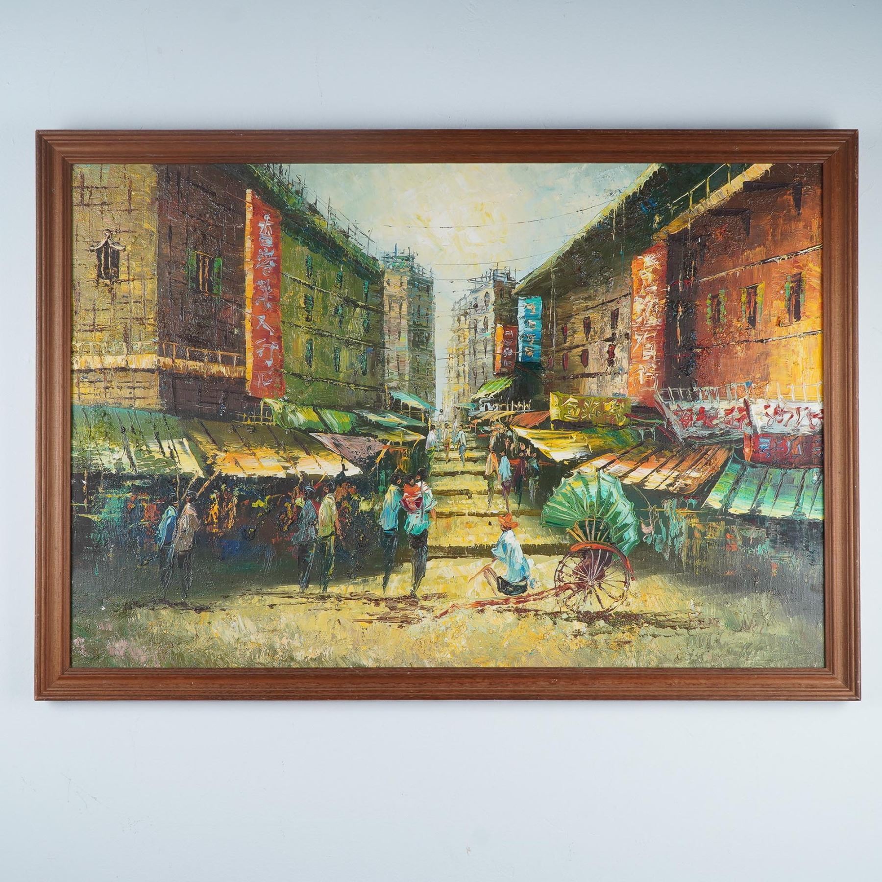 Striking oil on canvas painting depicting a bustling old Hong Kong street scene, alive with color, texture, and everyday movement. Rendered in bold impasto strokes, the composition features a central stairway lined with street vendors, pedestrians, and traditional signage in Chinese characters. The tall apartment blocks and vibrant market stalls capture the energy and character of mid-century Hong Kong. A rickshaw and seated figure in the foreground add depth and cultural context to the piece. Signed in the lower right, presented in a simple wood frame.