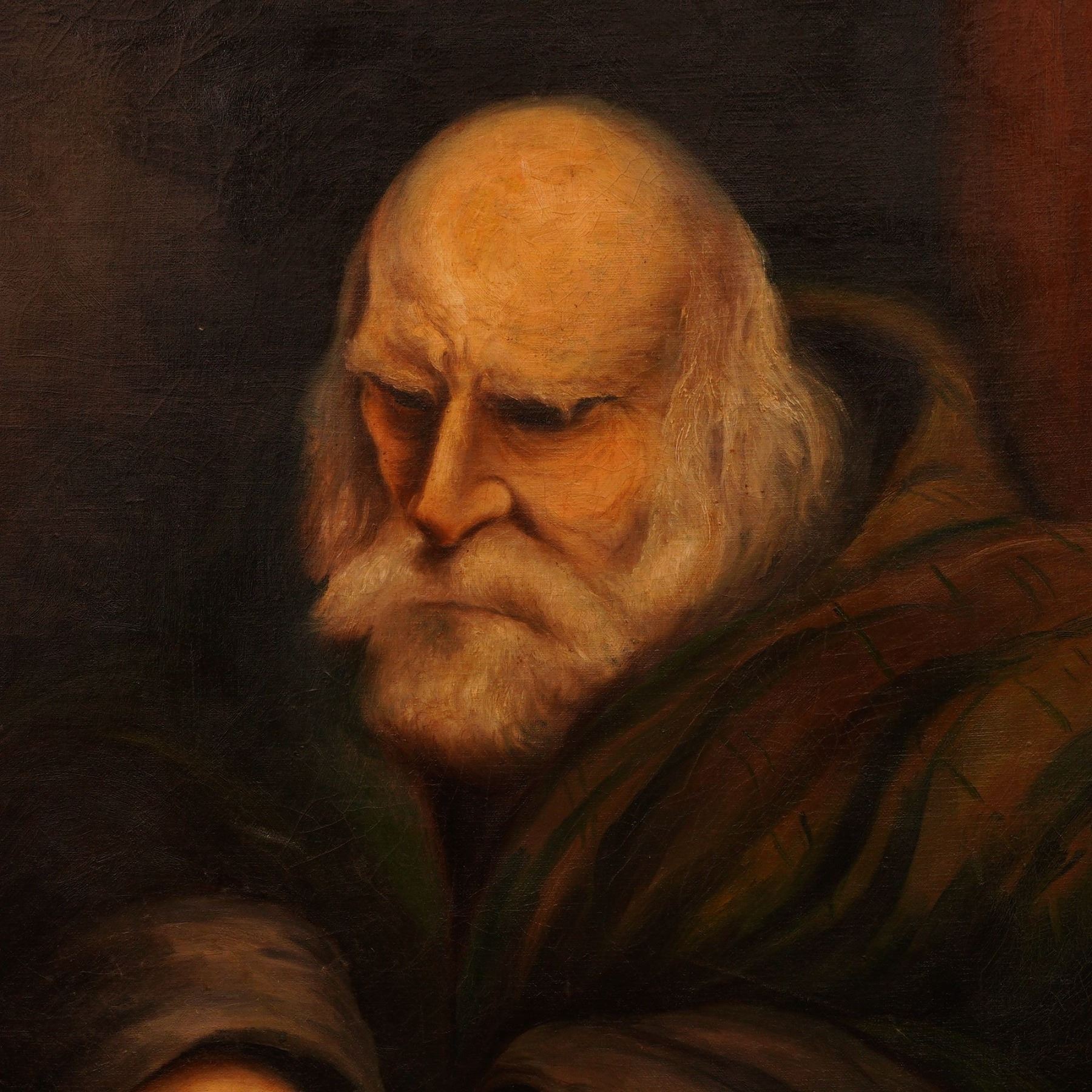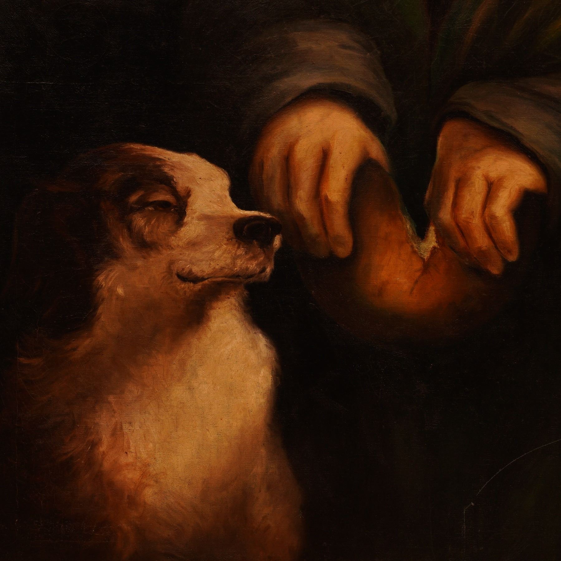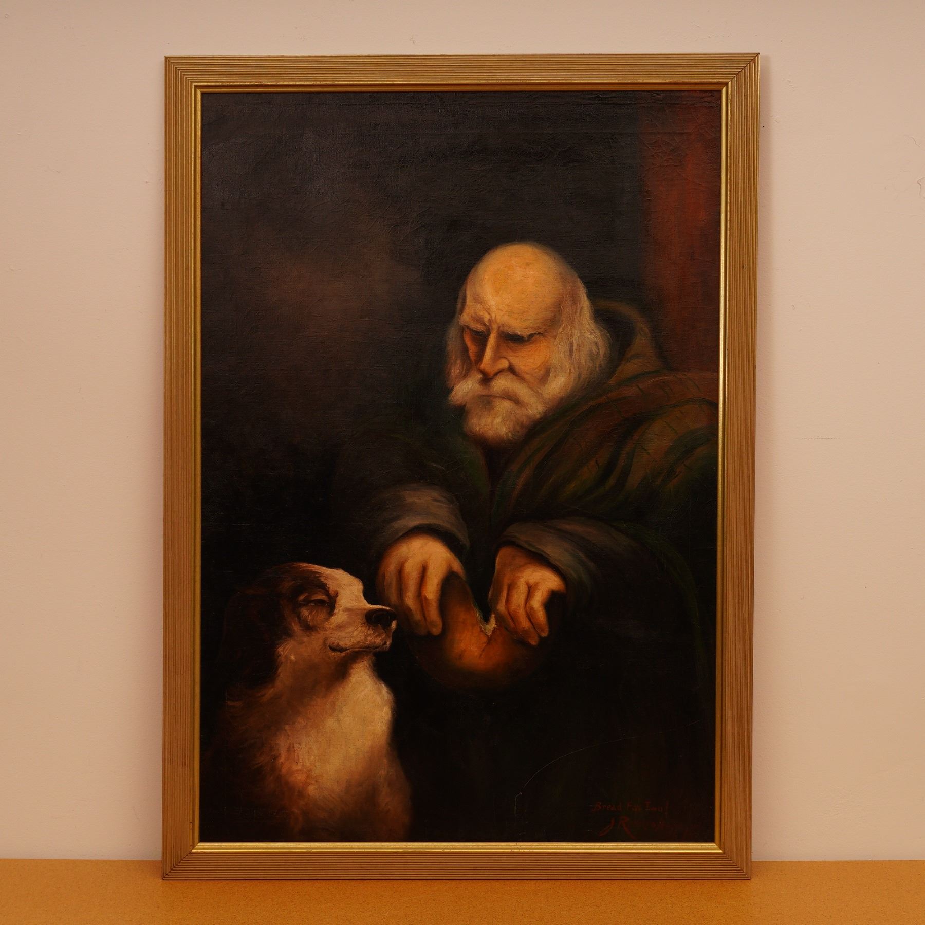 This evocative oil-on-canvas painting titled Bread For Two! depicts an older man, clad in a richly draped robe, gently offering a loaf of bread to a patiently expectant dog at his side. The warm chiaroscuro palette and the image of quiet generosity lend the work a timeless, almost devotional sensibility, elevating a humble scene into a moment of human-animal communion. Signed in red in the lower right corner J. Romero Nuzza (or Nugga) NY 99. Presented in its original gilt wooden frame.