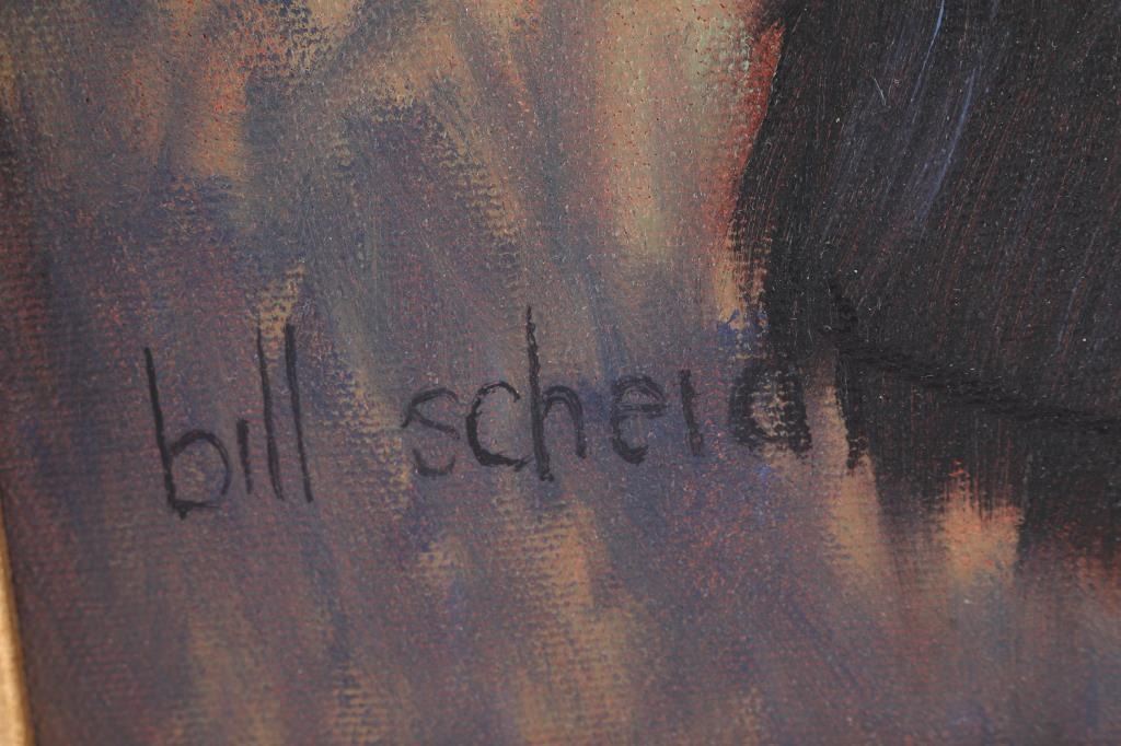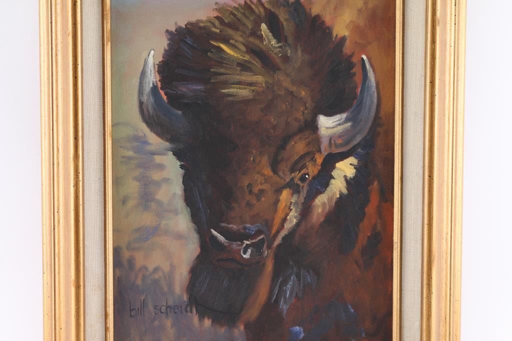 By Bill Scheidt depicting a bison bust. Signed lower left corner with inscription on back, "1998 Quick Draw, Phippen Show, Bill Scheidt". Born in San Antonio, Scheidt is largely self-taught, though he has studied with several members of the Cowboy Artists of America, and he has exhibited his works in invitational shows. He attributes James Reynolds, Ron Riddick, and Roy Anderson with having the greatest influence on his own artwork. Measures 19" x 16" in off white matting with gold tone wood frame. Canvas measures 13 1/2" by 10 1/2".