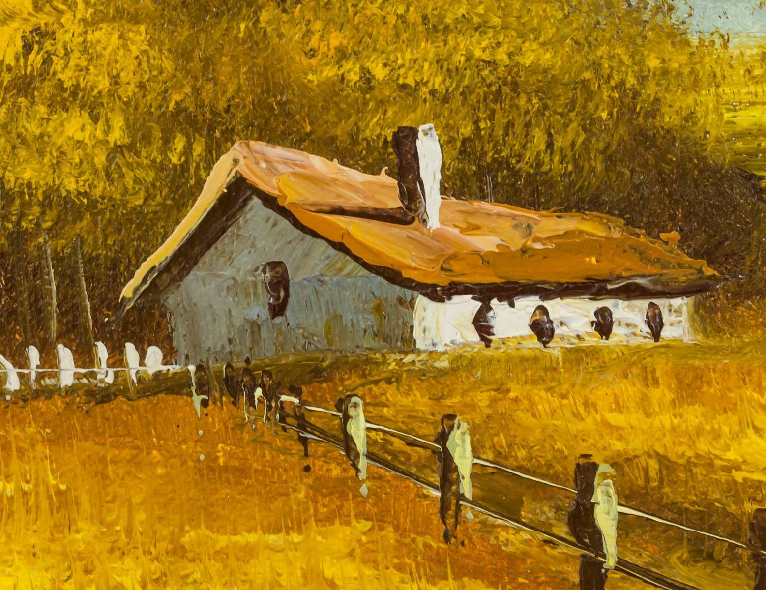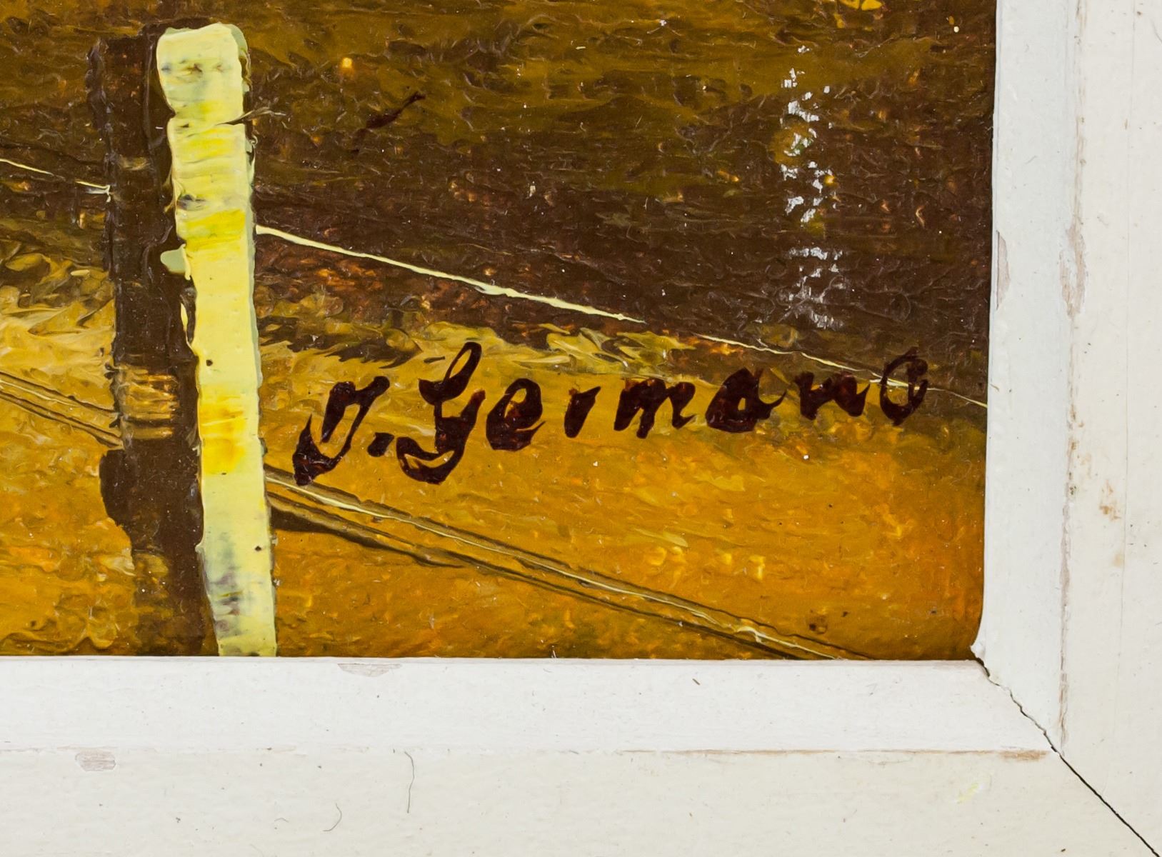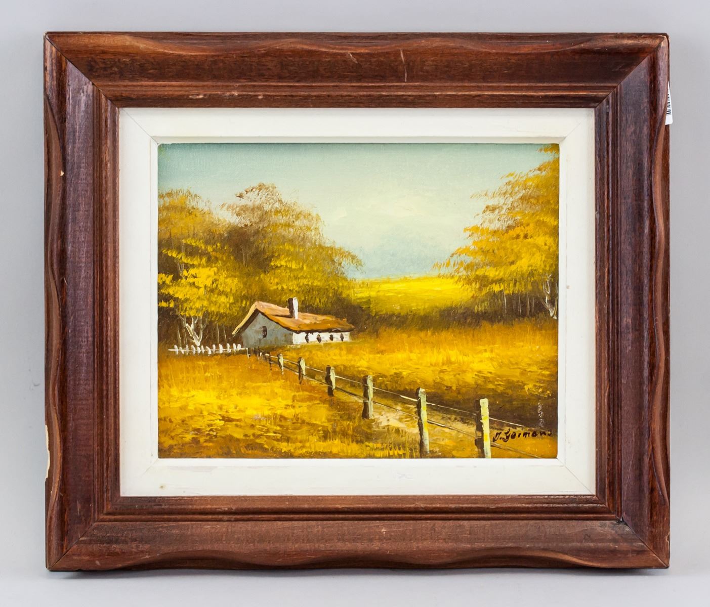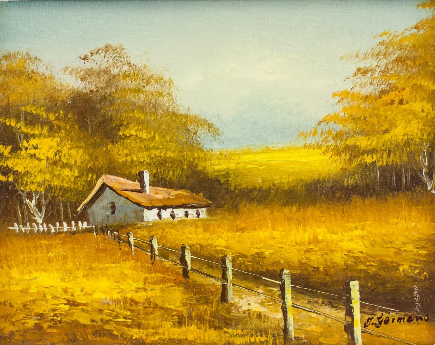 Oil on canvas, framed. Featuring a farmhouse in the distance, framed by golden trees and fields. Signed "J Germano" in the lower right corner. 19 x 23 cm (7.5 x 9.25 in), Frame: 31 x 37 cm (12 x 14.5 in). PROVENANCE: Hamilton, Ont. estate