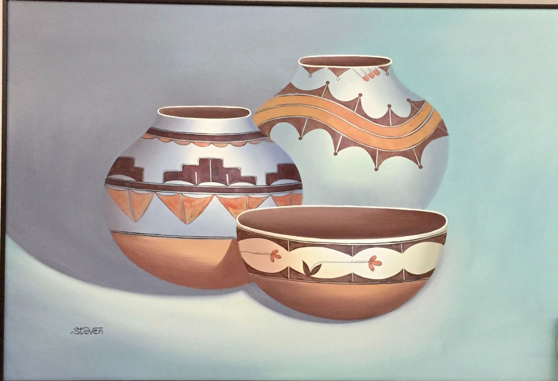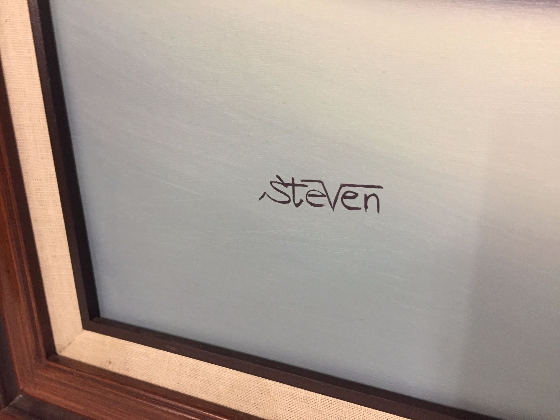 Maker: Signed, Steven. Approx. Age: Circa 1970s. Size: 43” x 30 3/4” including frame. Additional Info: Original oil painting on canvas signed by Steven. Condition: Good. Please look closely at the pictures - they are an important part of our description. Shipping: There will be a $15 handling / packaging fee for shipping this lot. The actual cost of postage will be added on top of that.