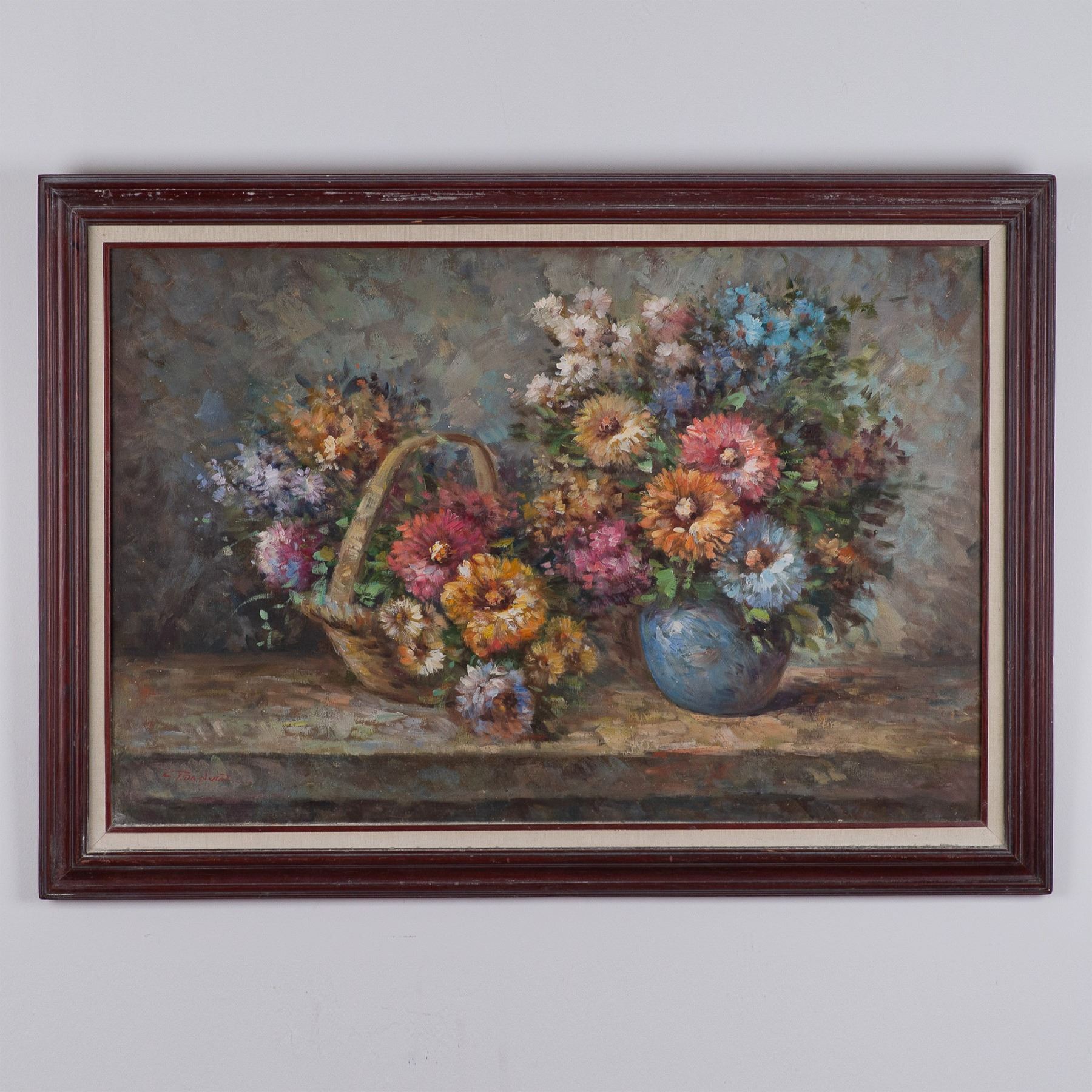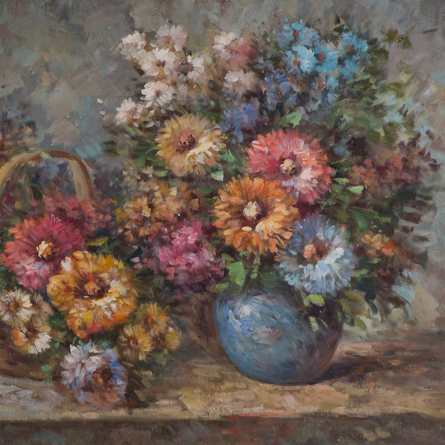 This captivating oil on canvas painting showcases a richly detailed still life composition featuring an array of colorful chrysanthemums displayed in a woven basket and a blue ceramic vase. The vibrant blossoms, rendered in hues of pink, yellow, orange, blue, and white, are meticulously arranged, exuding an air of elegance and freshness. The textured brushstrokes bring life and dimension to each petal and leaf, while the muted background emphasizes the brilliance of the flowers. The artist demonstrates a mastery of light and shadow, creating depth and enhancing the natural beauty of the arrangement. The rustic tabletop and the earthy tones in the background contribute to the painting's timeless appeal. Framed in a classic wooden frame with a linen border, this artwork is a celebration of nature's beauty and would add charm to any space. Signature on lower left. Artwork dimensions: 35.50"L x 23.50"H. Frame dimensions: 41.50"L x 29.50"H x 2"W.