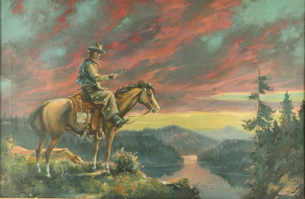 "Fire in the Sky" signed lower left. Image measures 23 1/2" x 35 1/2" with linen inset that needs to be replaced and a carved wood frame. Mr. August Lenox was born in 1908, in a sod house homestead on the plains of North Dakota. As a young boy, he was fascinated by the adventures and lives of pirates and painted several scenes of them on canvases. He also wrote several stories about their lives. In the1950s, he worked for Walt Disney illustrating comic magazines for children. Lenox became a permanent resident of the Texas Hill Country where he painted western subjects in oil of cowboys and Indians. He painted these true-to-life stories into his canvases because he lived them as part of the Chuck Wagon West. Now in his middle sixties, long gone from the Cow Camps, Lenox paints the passing scenes of our Wild West. While not anti-social this man was neither a mixer nor joiner but one of the real Cow Pokes of the open range Cow Camps. He painted western art based on a true story in every painting. A permanent Foundation has been established in Los Angeles to house several series of Lenox's Historical Paintings about the early West. The first of this series which includes the twenty large paintings that tell the tragic story of the great buffalo slaughter has been completed and hung. Other series are being painted at this time.