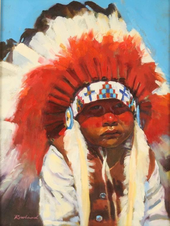 depicting a young boy in a feather headdress. Signed lower left. Image measures 23 1/2" x 17 1/2" in gold wood frame with linen inset. Christopher Rowland was born and raised on the Northern Cheyenne Reservation, at Lame Deer, Montana, which was a tough life. Rowland found his escape from his tortured youth in painting. Rowland sold his first 18" x 24" oil painting during his sophomore year in high school. That same year Rowland signed his first commercial contract to design tee-shirt logos with Bears Den of Colstrip, MT. A short few years later, at only 20 years of age, he painted his first commissioned portrait, a larger-than-life work, of the twin children of fellow Northern Cheyenne, Leroy Spang. Rowland met Jack Hines and Jessica Zemsky, his first mentors, at the Toucan Gallery in Billings, MT, in 1988. Upon seeing Rowland's work they offered him a scholarship to their two week workshop in Big Timber. Rowland was commissioned to design capital pieces for the Bronx Zoo, New York City. James Poulson and Howard Terpining became mentors and friends. Later, Terpning became one of Rowland's collectors purchasing a Rowland work at the 1998 American Miniatures Show, Settlers West Gallery, Tucson, AZ. Further recognition of his art by the Montana state government came when their Tribal Relations Report of 2006 featured Rowland oils on the front and back covers, as well as throughout the 70-page report. Rowland's artwork, both visual and audio, creates a peaceful and tranquil environment for everyone to enter and enjoy the moment, and its meaning, for their lives.