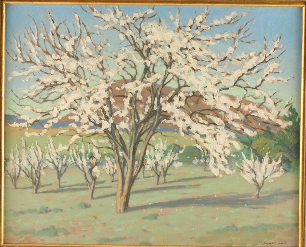 "The Prune Tree near Mount St Helena, California" signed lower right. Image measures 17 1/2" x 21 1/2" in carved gold wood frame. A landscape painter and muralist, Douglass Fraser was born in Vallejo, CA on Dec. 29, 1883. He was a pupil of Arthur Mathews at the Mark Hopkins Institute and of Frank DuMond and Charles Hawthorne at the Art Students League in New York City. By 1908 he was dedicated to painting scenes of the rugged Monterey coast and the oak trees of Solano County. For many years, he worked at Mare Island Navy Yard as a shipbuilder while painting in his leisure. A lifelong resident of his native city, he died on Aug. 6, 1955.