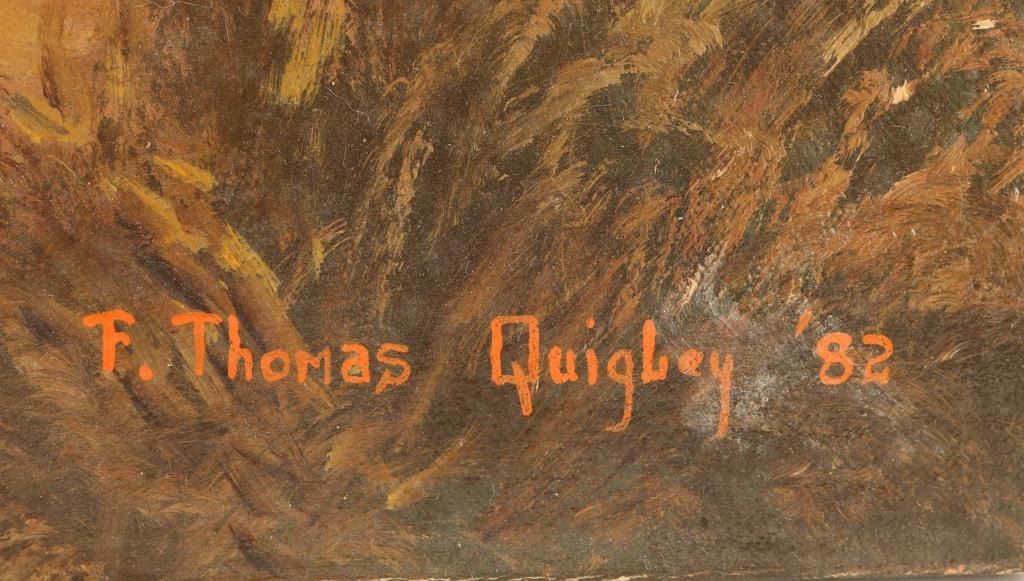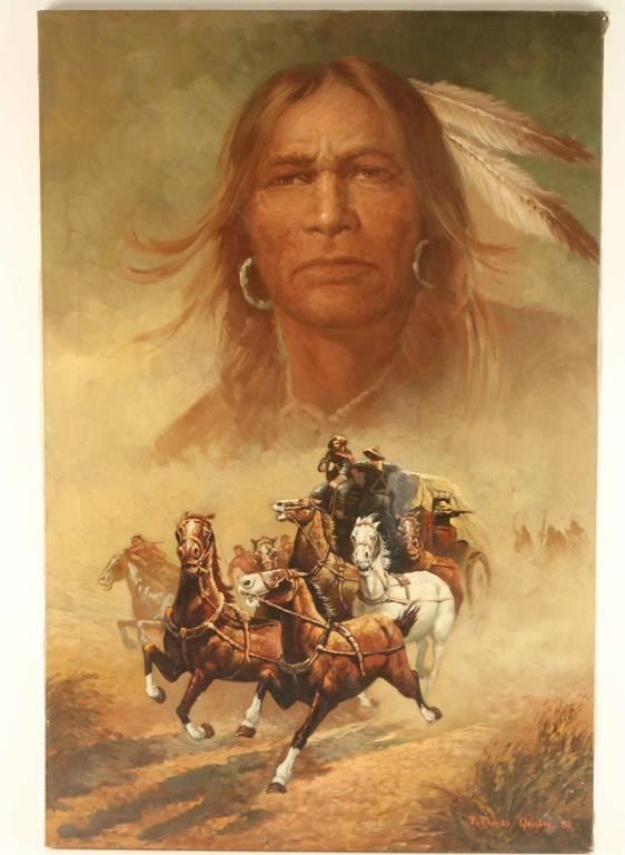 depicting stagecoach chase scene with portrait of Indian in the background, signed lower right. Image measures 36"x24", has some repair and cracquelure. F. Thomas Quigley (b. April 19th, 1928) born in Los Angeles, California. He graduated from The University of Southern California, East Los Angeles Jr. College and Alhambra Business College. Quigley was part of the U.S. Navy. The artist has taken many awards, these include: Ford Foundation Grant, Guggenheim Foundation Grant 1965 - Senator James D. Phalen Award.