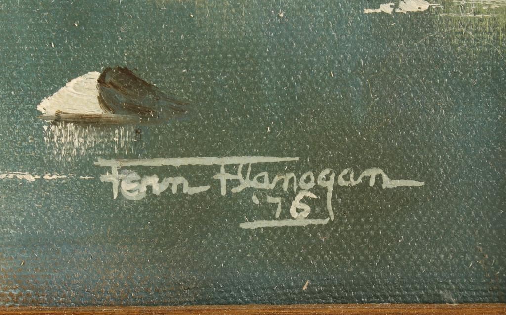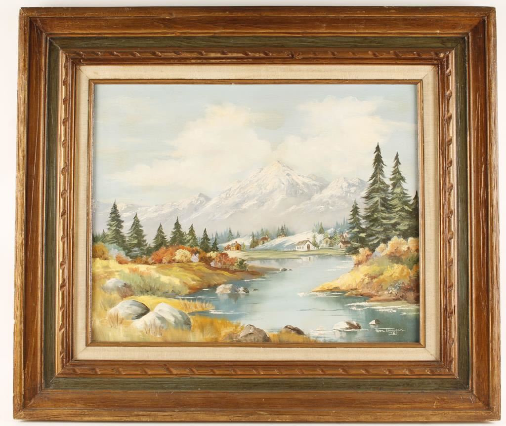 Mountain landscape with village and river in the foreground. Wood frame with linen insert. Image measures 15 1/2"x19 1/2".