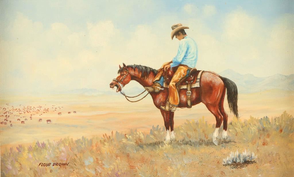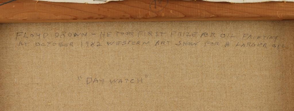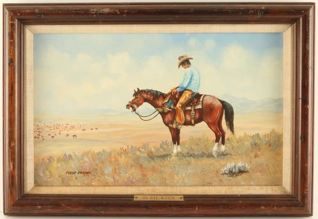 'On Day Watch' signed lower left. Image measures 9 1/2"x15 1/2" in wood frame with linen inset and brass title plate. Floyd Drown ha been painting all his life, he is a multi-award winner over the years and has been represented by galleries from Washington state to Florida. He attends the major art shows and participates in quickdraws and auction events whenever possible. Many books, magazines, Christmas cards post cards, etc...have shown his work. Floyd is basically a self taught artist who works in oils, watercolor, pencil and gouache. Teaching art to serious students has brought a respect to the common man to help and promote the arts. In an ever changing world, the story of the early pioneers, Indians, mountain men and even the modern day cowboy is the interest and art of Floyd Drown.