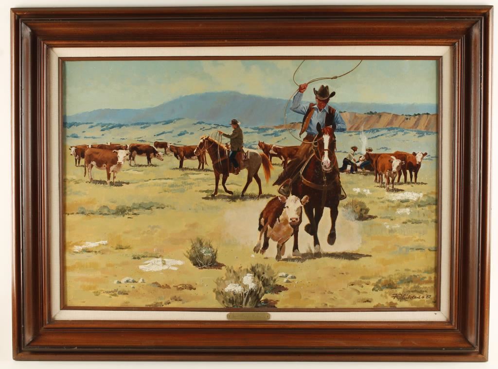 Entitled "Open Range Branding" Hand signed lower right hand corner and dated 1982. Frank Childers of Abilene, KS worked on ranches his whole life until he became a muralist for 4 years with works at the Cincinnati Union Station, St Bartholomew's Cathedral, Radio City Music Hall, and many others. He was also an art director and illustrator in New York and has appeared in many national magazines for his paintings and portraits of the rugged American West. He is now living a ranch life in Santa Barbara County, CA. Image size 30 1/2"x19".