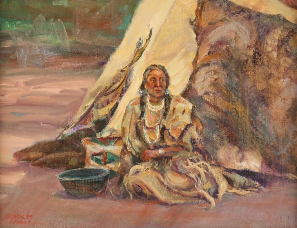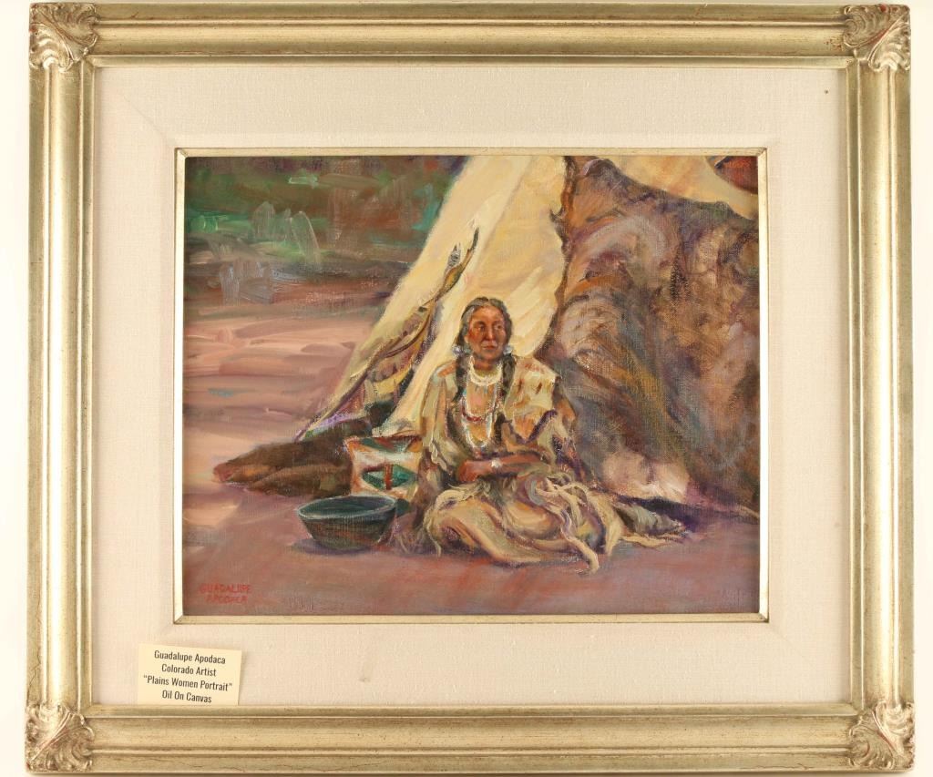 "Plains Women Portrait" signed lower left. Image measures 15 1/2" x 19 3/4" in pewter wood frame with large linen inserts and matching fillet. A pastel and oil painter of landscapes, figures, and portraits in an impressionist style, Guadalupe Apodaca was born in Fort Collins, Colorado and lived for many years in Sedona, Arizona. He moved to Denver in the late 1990s, and is a long-time member of the Pastel Society of America. He began drawing and painting at the age of three and has said his most influential art teacher was George Cherepov who encouraged him to paint landscapes in Portugal, Spain, and Mexico as well as the American Southwest.