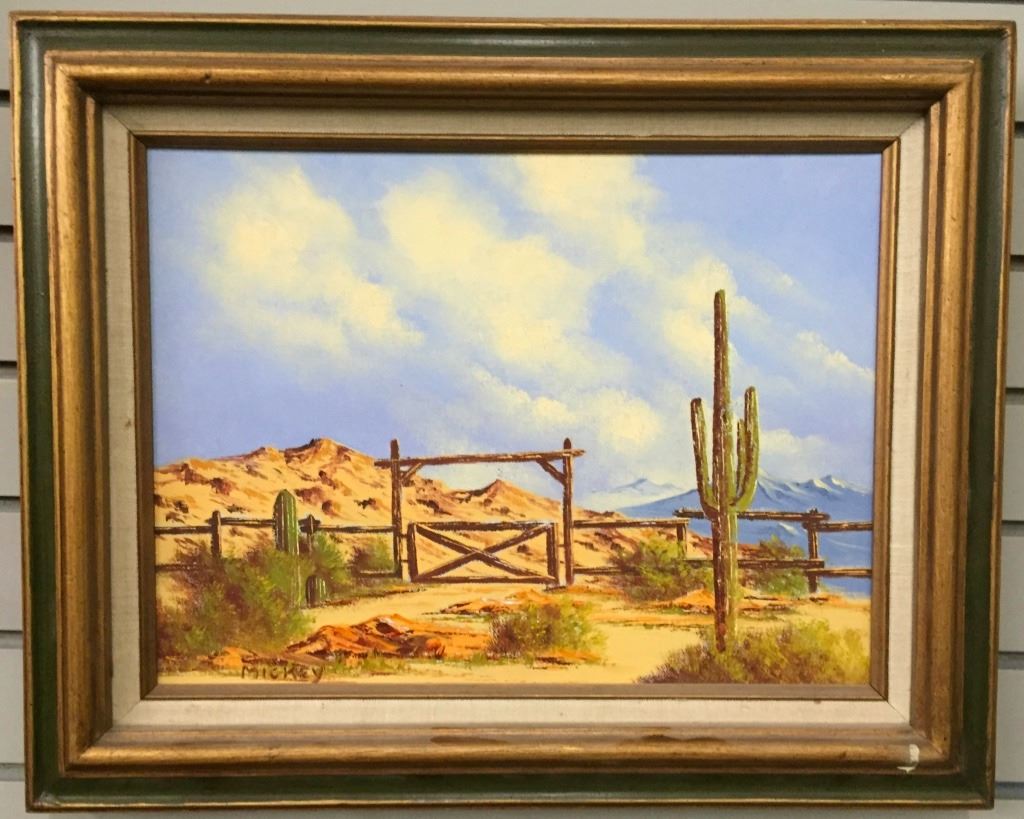 This original oil on canvas of a desert scene measures 20.5" x 16" including the frame. Please look closely at the pics as they are an important part of our description. Shipping: There will be a $8 handling / packaging fee for shipping this lot. The actual cost of postage will be added on top of that.