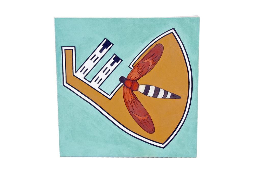 Original Oil on Canvas by Mildred Yollestened Depicting Indian good luck symbols with a dragonfly.Depicting Indian good luck symbols with a dragonfly.