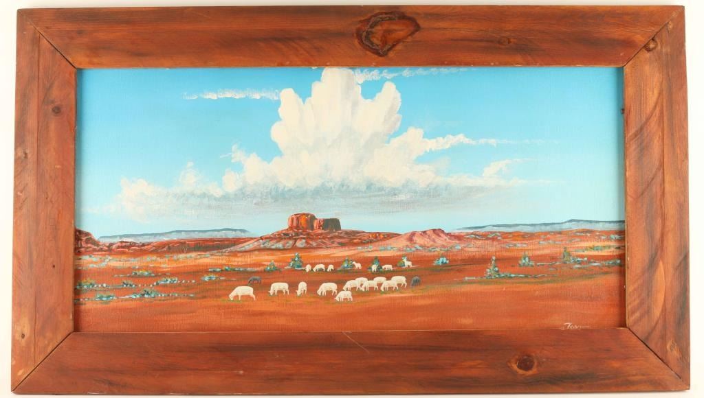 Navajo artist entitled 'Navajo Land' image size 35"x20" in wood frame.
