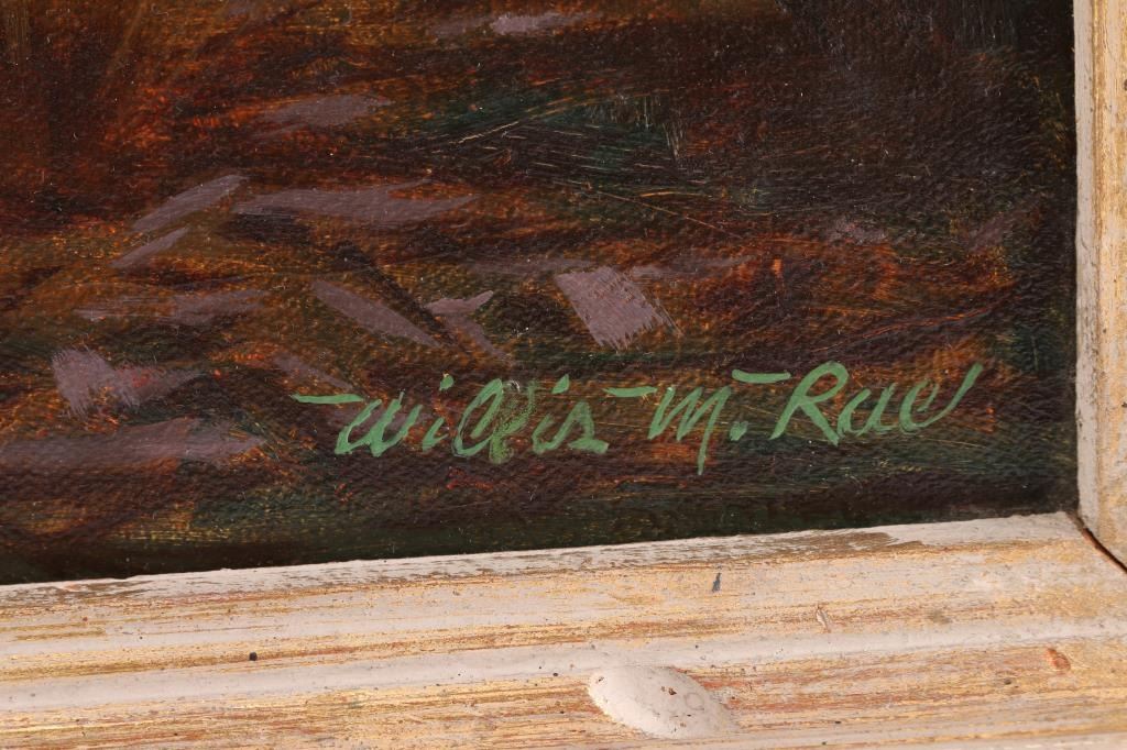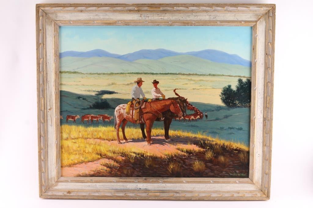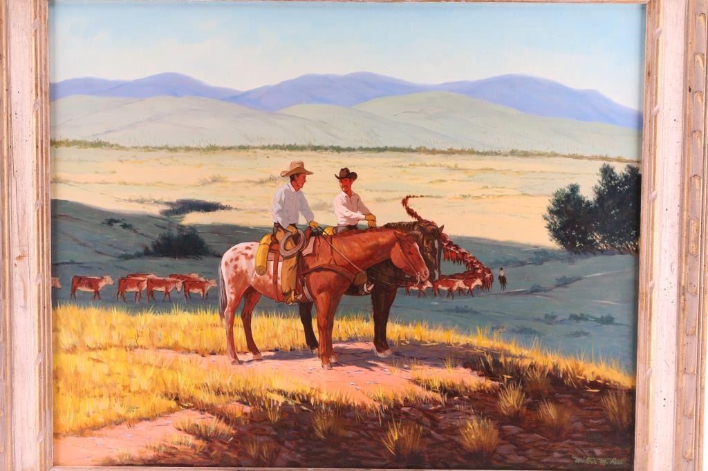 Depicting cowboys on horseback with a cattle train. Signed lower right-hand corner. Measures 29x23". Willis M. Rue (1908-1991). Known for horses, frontier landscape and Indian portraits.