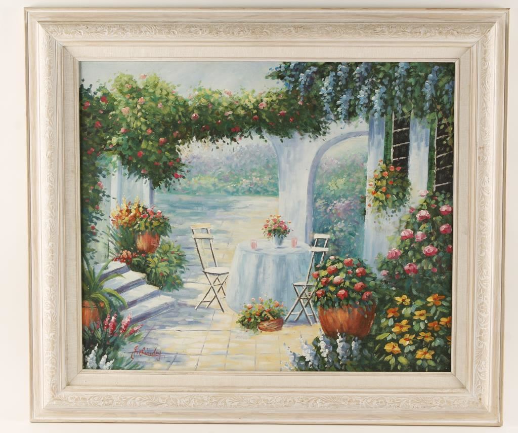 Signed by John Lindey in white frame with floral motif. Image size 24"x20"