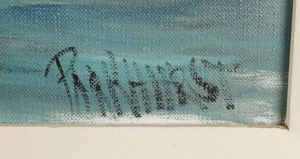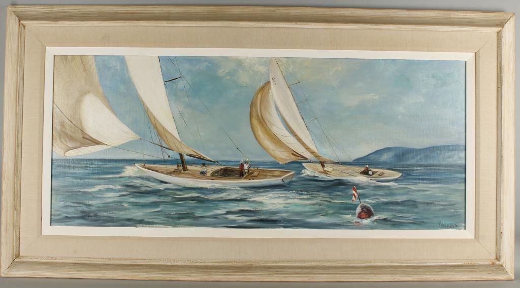 By noted artist Violet Parkhurst (1928-2008), 20" x 48", depicting a beautiful seascape with sail boats against a cloudy sky. Created 1975. Condition is poor/good, restoration would enhance value. Violet Parkhurst, a well known seascape artist in Southern California, was born in the small town of Derby Line, Vermont on April 26, 1921 and died in Rancho Palos Verdes, CA on January 13, 2008. She studied art at the School of Practical Arts in Boston and at Baylor College. She was a prolific painter and her paintings can be seen throughout the world and in the collection of several museums and private collections. For the last 45 years she owned her own gallery in the Ports of Call Village in San Pedro, CA. The very popular gallery featured primarily her own paintings where thousands of visitors enjoyed viewing her artwork. Her works have been owned by many famous people including President Ronald Reagan, President Bush, Prime Minster Thatcher, President Nixon, and Tom Selleck just name a few. Also includes a certified appraisal from Parkhurst Galleries Inc. for a replacement value of 8,200.00 USD.
