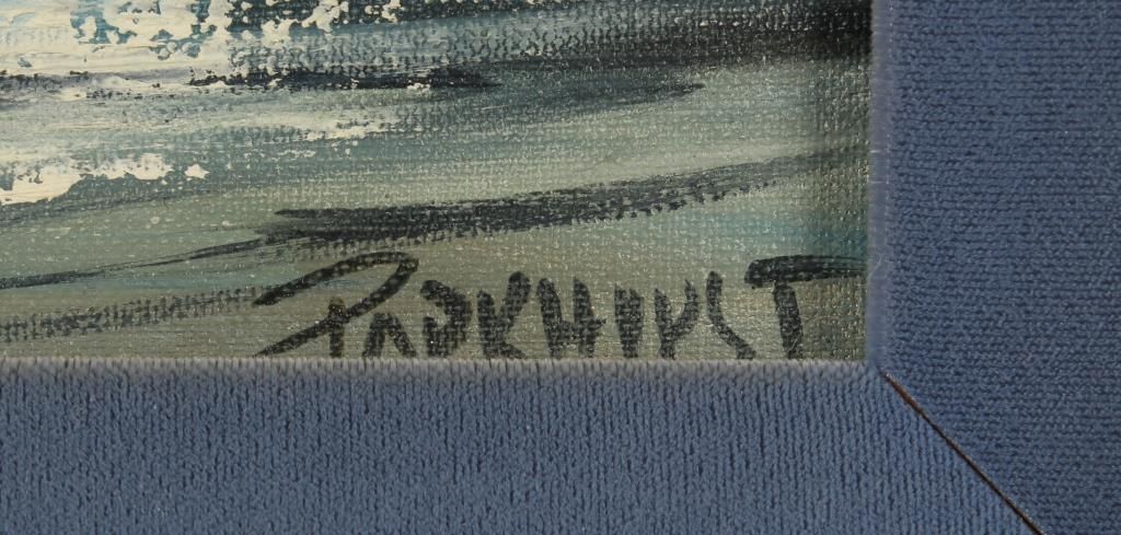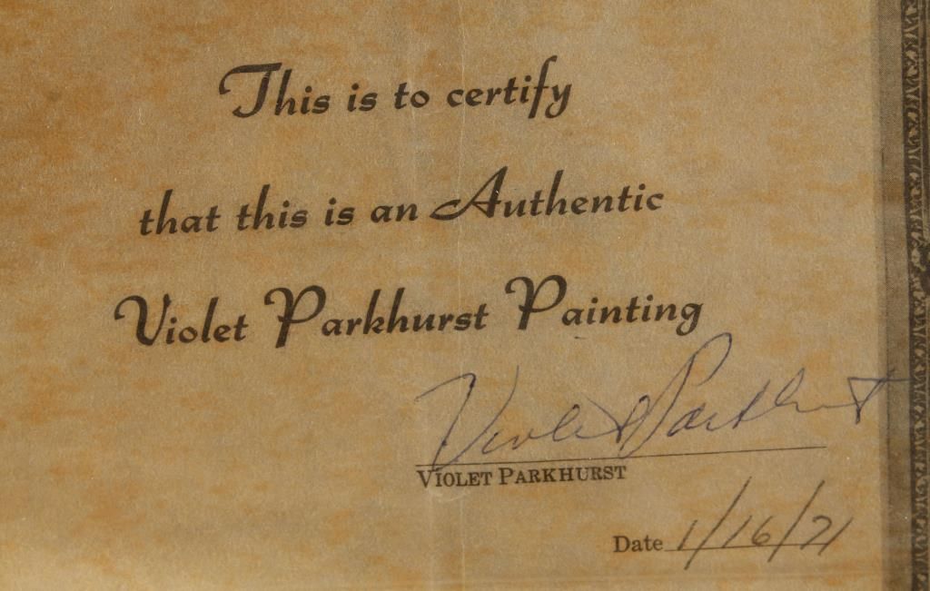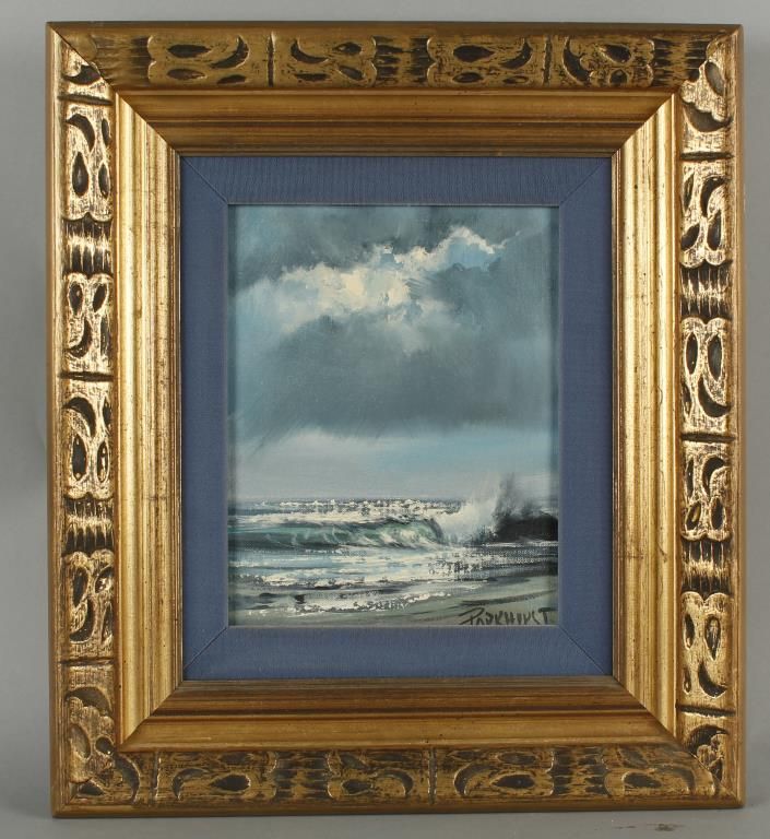 By Violet Parkhurst, 10" x 8"depicting a seascape scene. Created 1971. Violet Parkhurst, a well known seascape artist in Southern California, was born in the small town of Derby Line, Vermont on April 26, 1921 and died in Rancho Palos Verdes, CA on January 13, 2008. She studied art at the School of Practical Arts in Boston and at Baylor College. She was a prolific painter and her paintings can be seen throughout the world and in the collection of several museums and private collections. For the last 45 years she owned her own gallery in the Ports of Call Village in San Pedro, CA. The very popular gallery featured primarily her own paintings where thousands of visitors enjoyed viewing her artwork. Her works have been owned by many famous people including President Ronald Reagan, President Bush, Prime Minster Thatcher, President Nixon, and Tom Selleck just name a few. Also includes a certified appraisal from Parkhurst Galleries Inc. for a replacement value of 900.00 USD. .