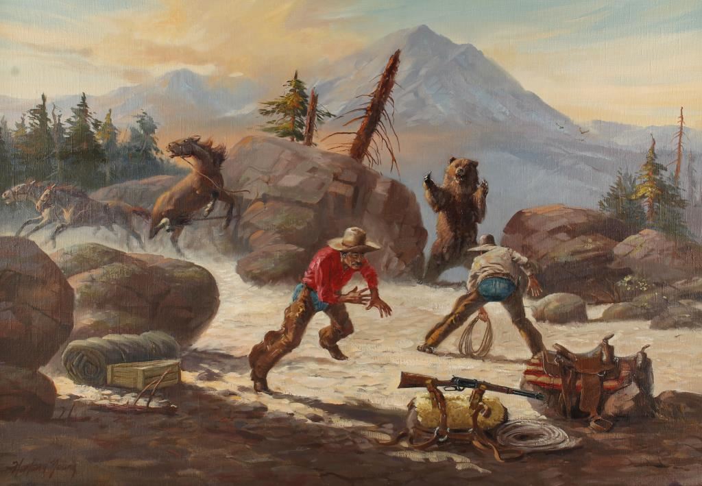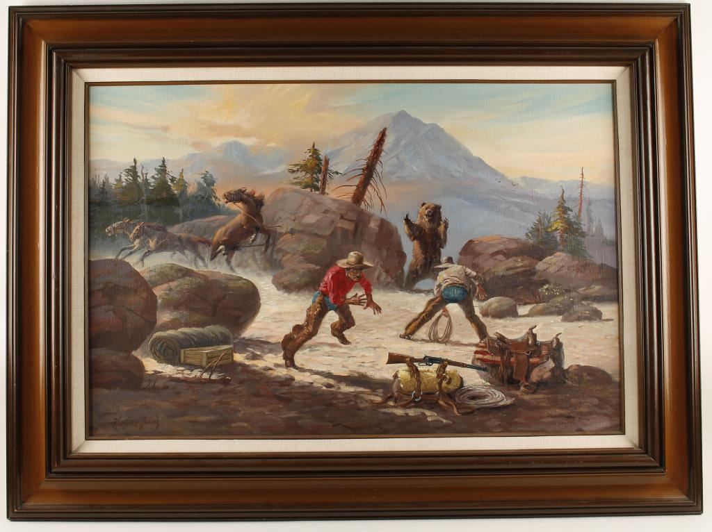 By noted Western artist Harland Young entitled "Intruder" depicting a grizzly bear coming into camp. Signed lower left hand corner. Image measures 36"x24". Original purchase price $5200. In wood frame. Bio info: Harland Young is a painter and sculptor whose work reflects his love of the American West. Young was born in 1924 in the Ozark mountain town of Neosho, Missouri, but he grew up on a horse and cattle ranch in California. Thus began his intense admiration for animals and the outdoors. Except for his period of service with the Air Corps in World War II, his entire life has been devoted to his art and his horses. He attended the Art Center College in Los Angeles and graduated in 1951 with a Bachelor''s of Fine Art degree. He then worked for eleven years as a commercial illustrator for an ad agency. In 1956 he opened his first studio.