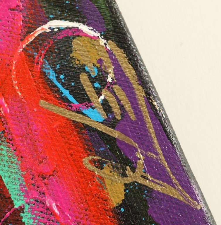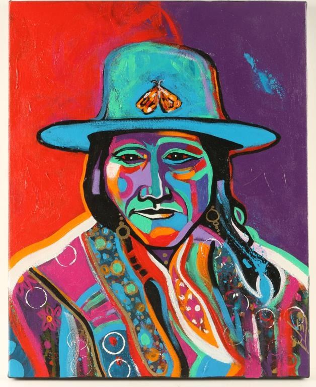 Artist Jimmy Lee depicting an Indian wearing a hat with a butterfly on it in vibrant colors. Signed lower right. Image measures 16"x20" unframed.
