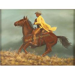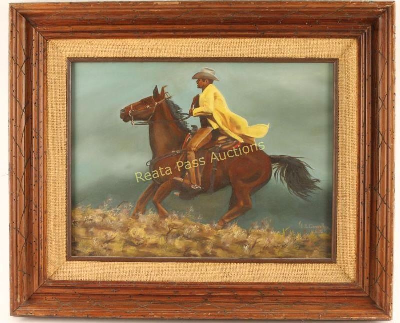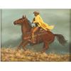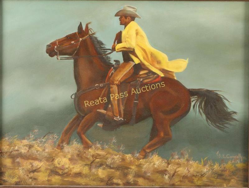 Signed 'W L Connelly 06' lower right depicting cowboy in yellow slicker on running horse. Image measures 15 1/4"x111/2" in wood frame with burlap inset.