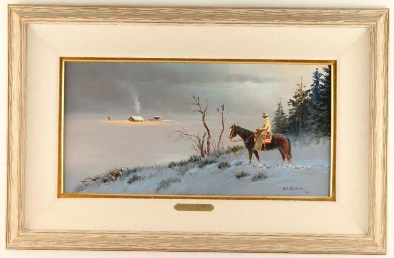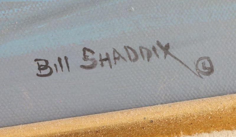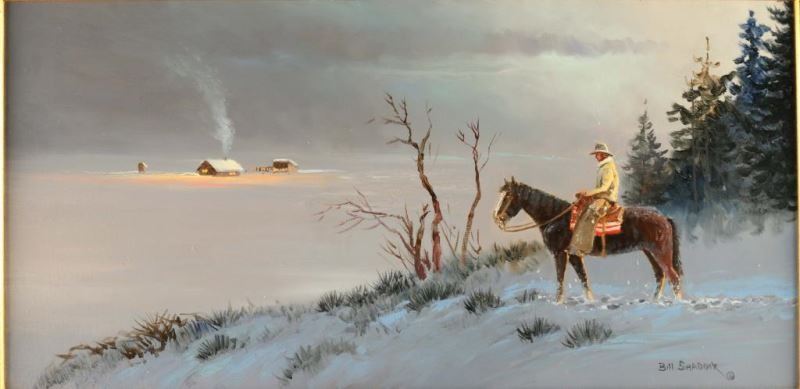 by noted artist Bill Shaddix entitled " A port in the Storm", image size 24X13" Bill J. Shaddix was born in Oklahoma on November 30, 1931. Shaddix grew up in poverty in the Dust Bowl. His family moved to southern California in the 1940s. In 1956 he became the deputy sheriff of Orange County, California while painting in his leisure. A self-taught painter, as he gained fame, he soon became a full-time artist. His early works are mostly southern California landscapes; whereas, he later found inspiration in the Rock Mountains. He settled in Phoenix, Arizona where he continues painting the romance and lore of the cowboy and Indian era.
