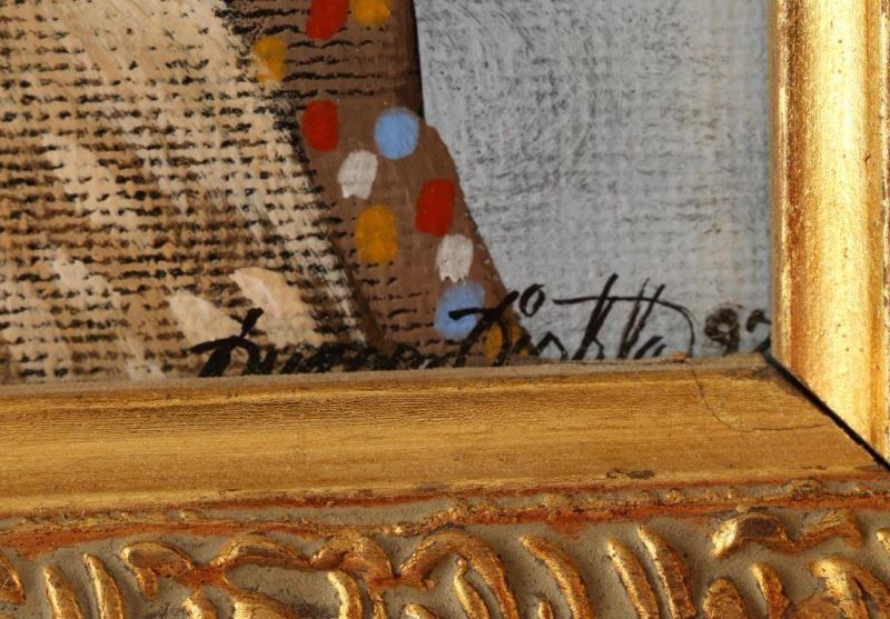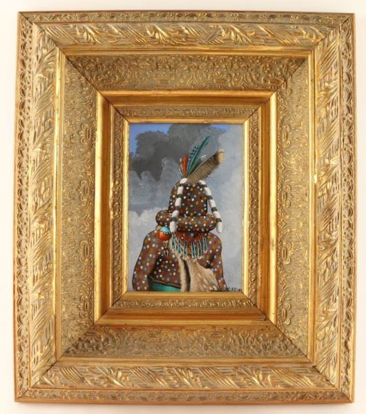 by Duane Dishta entitled 'Fire God'. Signed lower right hand corner in ornate gold frame. Image size 5"X7". Duane Dishta was born in Zuni, New Mexico in 1946, and has always lived there. Duane's father, Frankie, is Zuni and his mother, Elizabeth is three-quarter Zuni and one-quarter Hopi. Duane and his wife, Margie, have relatives in Polacca, Arizona on the Hopi reservation, where they often attend Hopi dances. Duane also takes part in the Zuni ceremonies every year. When there are no ceremonies taking place, he produces approximately four 24 x 36 paintings each month. He was originally inspired to paint by the a work of two Hopi painters, Raymond Naha & Neil David. His paintings always reflect Hopi and Zuni life. Duane is probably the best-known artist in Zuni. His paintings appeared in Barton Wright's book "Kachinas of the Zuni" which depicts 139 Kachinas and other dancers. Duane outlined figures with colored markers, erased the outlines, and painted the inside with watercolors. He painted them in the wintertime when there were no ceremonies taking place. Duane was also one of the featured artists in the book "Zuni, the Art and the People", Vol 2.