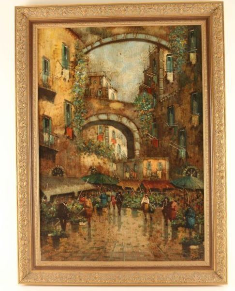 Depicting Italian street market scene. Signed by artist lower right. Canvas has been mounted on board and put in ornate molded gold wood frame. Image measures 26 1/2" x 18 3/4".